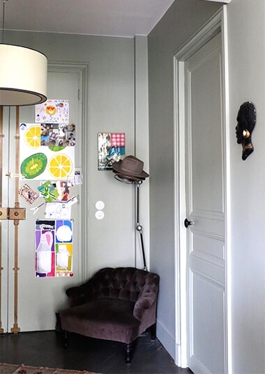 夫とふたりの娘の4人で暮らすマリー=アンヌは、あれこれ飾るのが大好き。玄関周りに棚を置いて、旅先で見つけたもの、ブロカントの掘り出し物など、彼女のお気に入りを飾るスペースにしているが、玄関のドアも飾らずにはいられない。子どもたちが描いた絵や、インスピレーションを与えてくれる広告など、彼女の感性に引っかかったビジュアルをコラージュしては、毎日目に触れるようにしている。出発前に古いチェアに座ってひと呼吸おけば、準備は完了。オンオフを切り替える場所になっている。