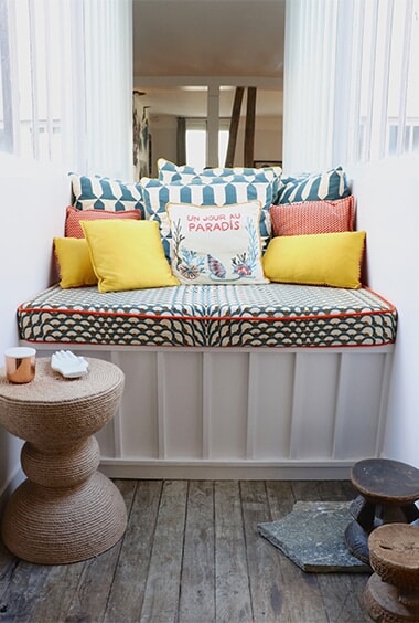 ホテルやインテリア、デザイン関連のPRとして活躍するジュリー。自宅のアパルトマンもホテルさながらの美しい内装を手掛けているが、かつて渡り廊下だったスペースを有効活用し、ベンチを置くようにした。狭さを感じさせないように奥に鏡を貼り、ベンチには明るいカラーリングのクッションをたくさん置いて、快適に過ごせるようにしたところ、いまでは家族全員が寛ぎにくるエスケープスポットに。