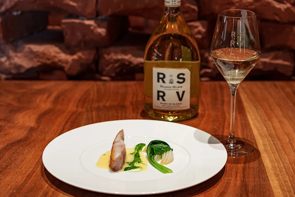 「メゾン マム」のシャンパーニュが持つフレッシュな果実味を最⼤限に引き⽴てる料理は、季節の⾷材はもちろん、爽やかな柑橘やハーブ、相模湾で収穫された新鮮な海の幸や地産野菜など、箱根の⼟壌の⾹りをまとった⾷材がセレクトされて、一皿一皿丁寧に仕上げられている。