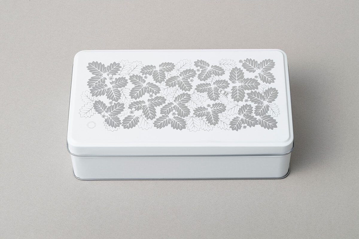 通常いちごを使った商品には、パッケージにもいちごのデザインがあしらわれているものだけれど、あえて缶の天面にいちごを描かず、いちごの葉と花をデザインしたのは、グラフィックデザイナーの大石知足さん。制作をするにあたり、本物のいちご・葉・花を見るべくいちご狩りに出かけて、葉の中からとびきりのいちごが現れるストーリーが思い浮かんだそう。それから、ジャムサンドクッキーそのものをいちごに見立てることで、缶のフタを開ける行為そのものが葉の中からいちごを探す行為と重なるように思いを込めている。
