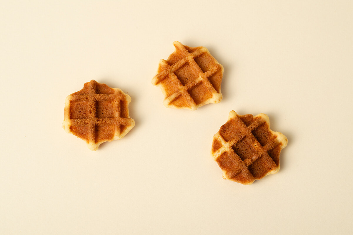 日の出屋製菓の新たなお菓子「ワッフルつかまえた」は、鈴鹿山麓で伸びやかに育った鶏の濃厚な自鶏卵、国産小麦粉、バターを使って、1枚ずつ丁寧に焼き上げたワッフル型のクッキー。アイスクリームと合わせたり、ジャムを添えて楽しむのにちょうどいいひと口サイズ。食感はさっくりと歯切れよく、ふわっと卵の風味が口いっぱいに広がる。