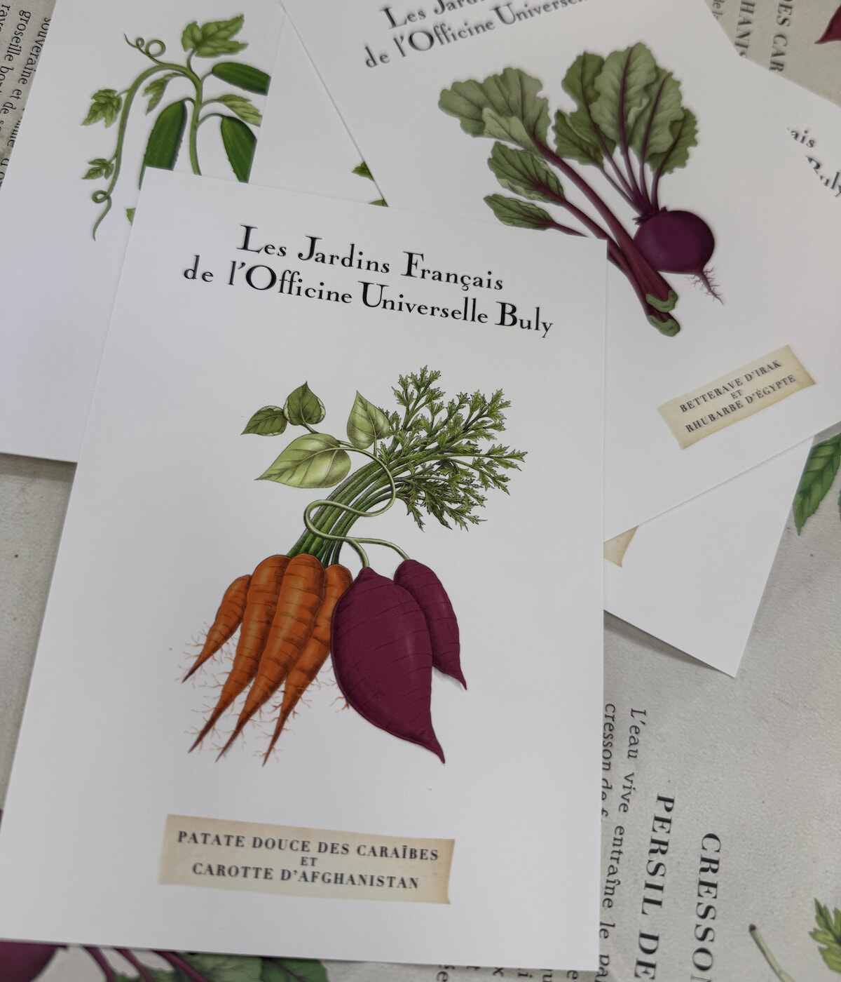 まず、「レ・ジャルダン・フランセ」コレクションの瑞々しい香りに、トマトやビーツ、ミント、バジル、そしてニンジンやサツマイモなどが描かれたポストカードをセレクトして、手紙を送る相手を決めます。次に、14種類のメッセージの中からひとつを選ぶとその場でカリグラフィーでメッセージを綴ってくれます。自分でメッセージを書き足すことも可能。最後にオリジナルの切手を貼ってもらい、ポストに投函すると後日郵送でポストカードが届きます。