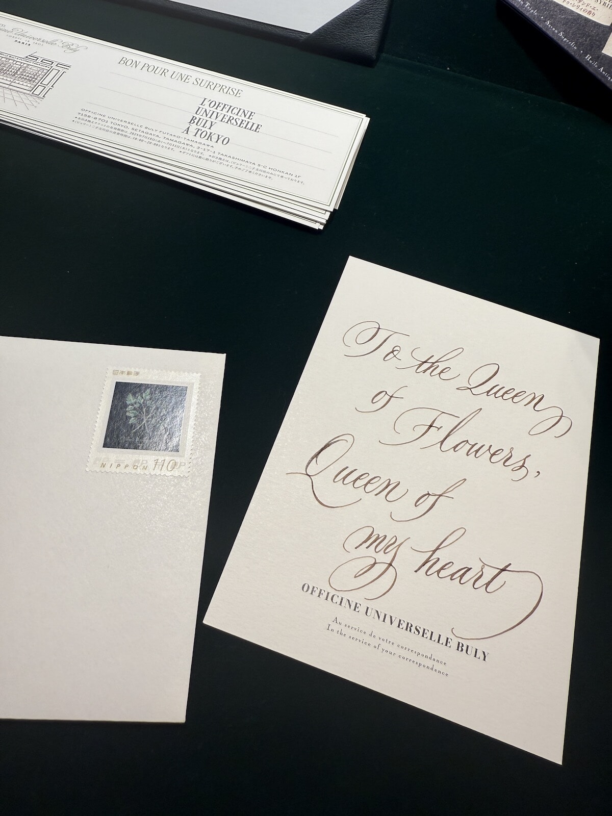 二子玉川 蔦屋家電で開催されているポップアップイベントの内容は、ビュリーの「レ・ジャルダン・フランセ」コレクションが香るポストカード「カルト・ポスタル・パルフィメ」を購入するとカリグラフィーのメッセージを入れ、郵送までしてくれるというもの。夏の香り=ビュリーな私。暑い日には甘い香りのフレグランスをあえて選びたくなるのですが、そんな時に決まって纏うのが水性香水「オー・トリプル チュベローズ・デュ・メキシク」。夜は、バスソルト「セル・ドゥ・バン・オドリフェラン ヘリオトロープ・デュ・ペルーの香り」を使って湯船に浸かるのが定番です。このポップアップにも心誘われるまま訪れました。