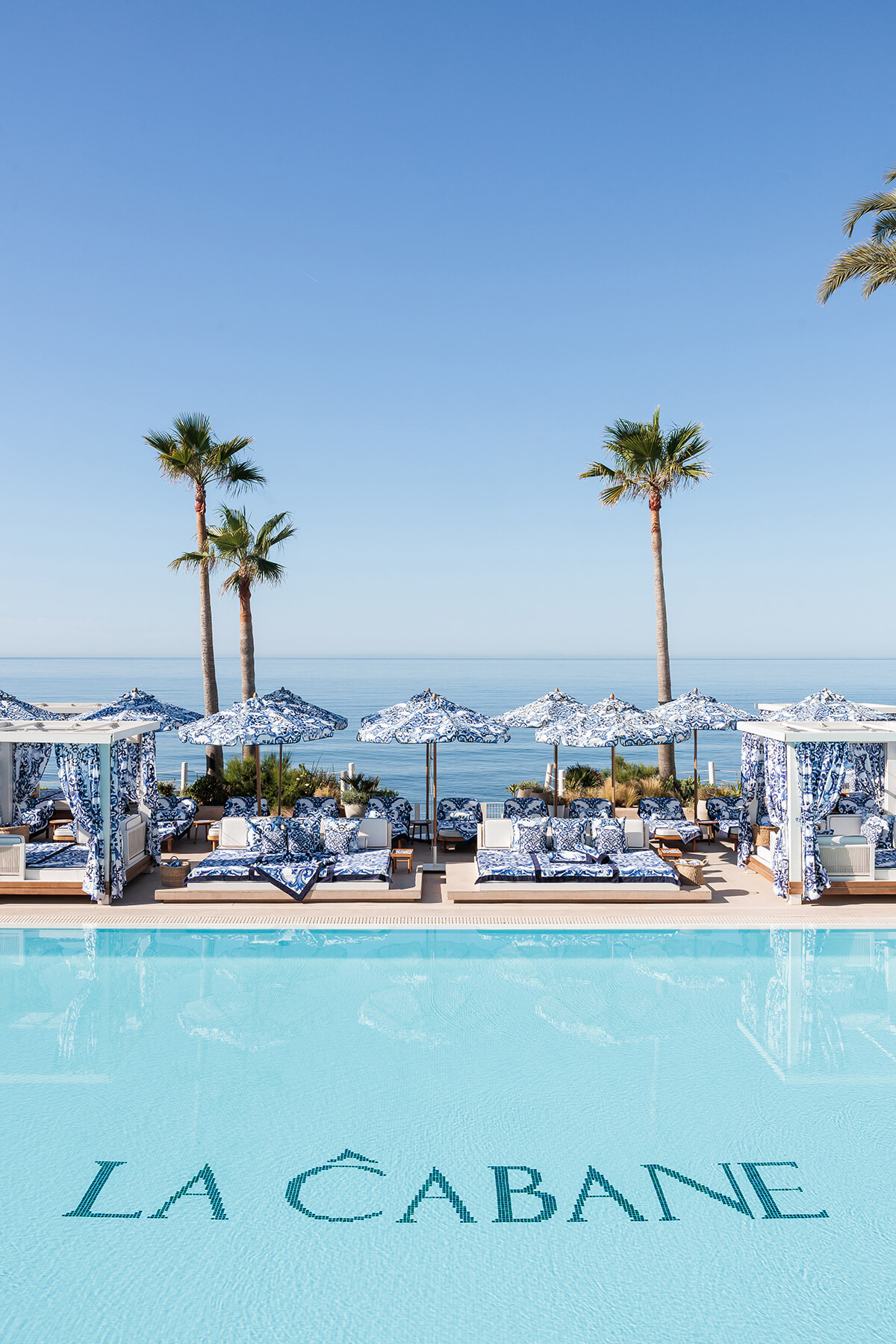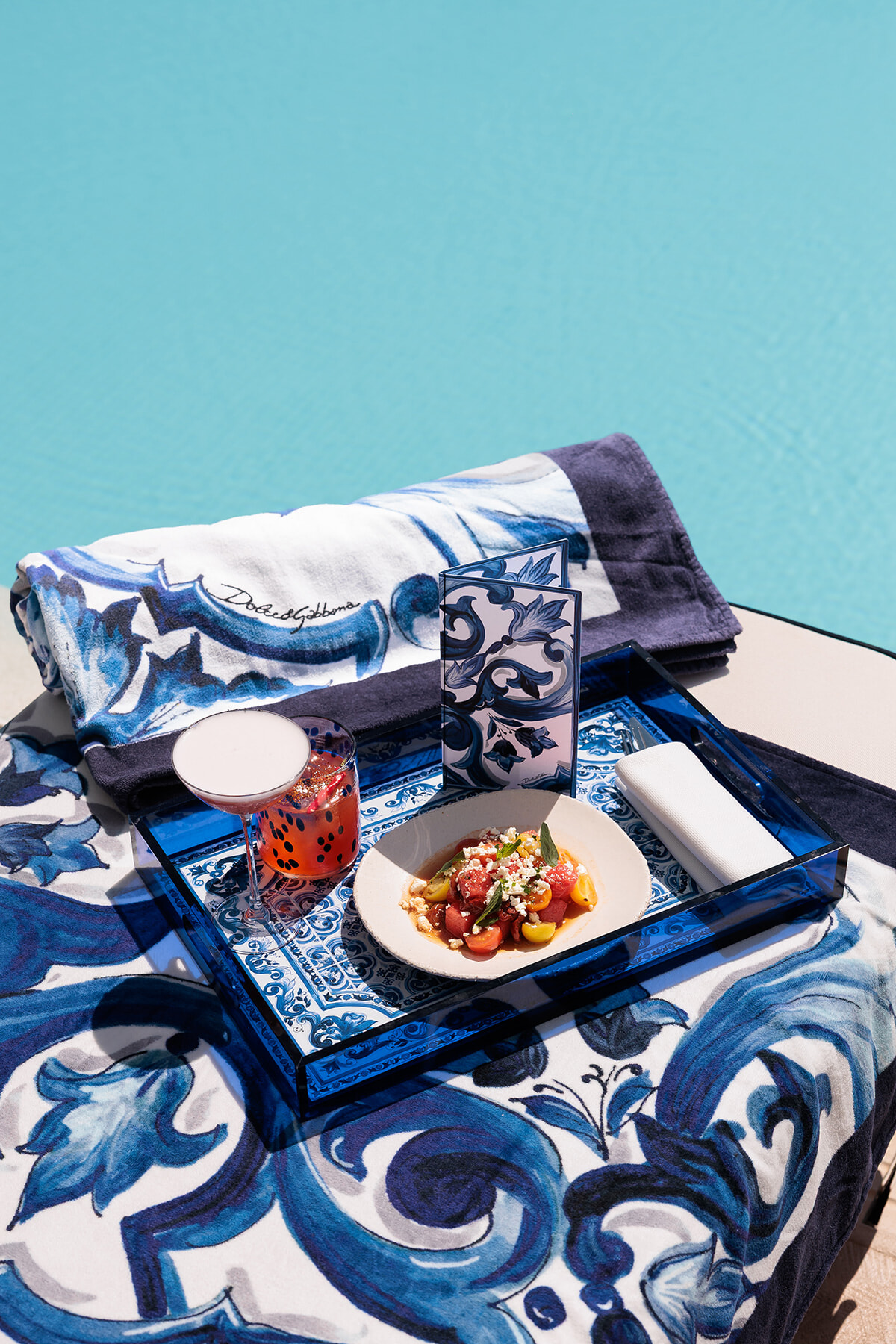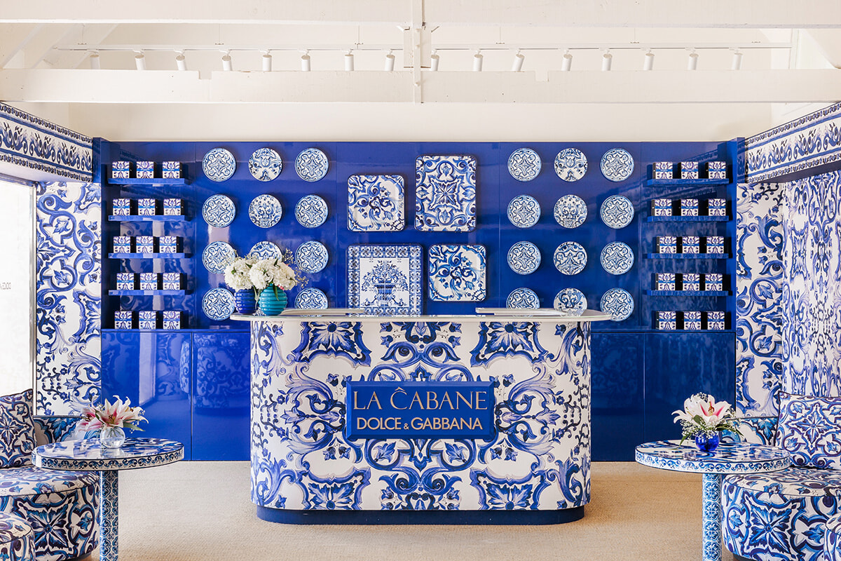 今回、ドルチェ&ガッバーナは、ロス・モンテロス・リゾート内にあるビーチクラブ、ラ・カバーニュの空間を「ブルー メディテラネオ」仕様に。南イタリアの伝統的な陶器に見られるホワイトとブルーの鮮やかなコントラストを描いたパターンが、プールエリアや海に面したテラスに加え、今年はレストランスペースにまで施され、訪れる人々をラ・ドルチェ・ヴィータ(甘い生活)の世界、そして真のイタリアンホリデーのムードへと誘う。