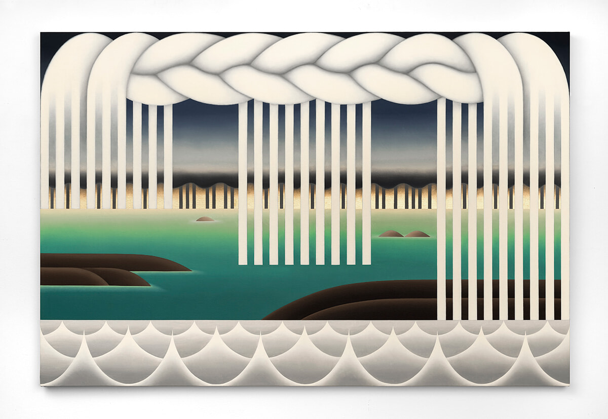 山口氏の描く海景作品では東西に限らず、時代をまたぐ美術様式が融合する。抽象と幾何学模様や大胆な形状と繊細なパターン、ディエゴ・リヴェラらのような社会主義壁画、アール・ヌーヴォー、日本画やロマン主義を連想するゴールド使いなどが洗練された美しさとして混在する作品の前に立ち止まると、静かに引き込まれるように惹きつけられてしばし目を離すことができない。