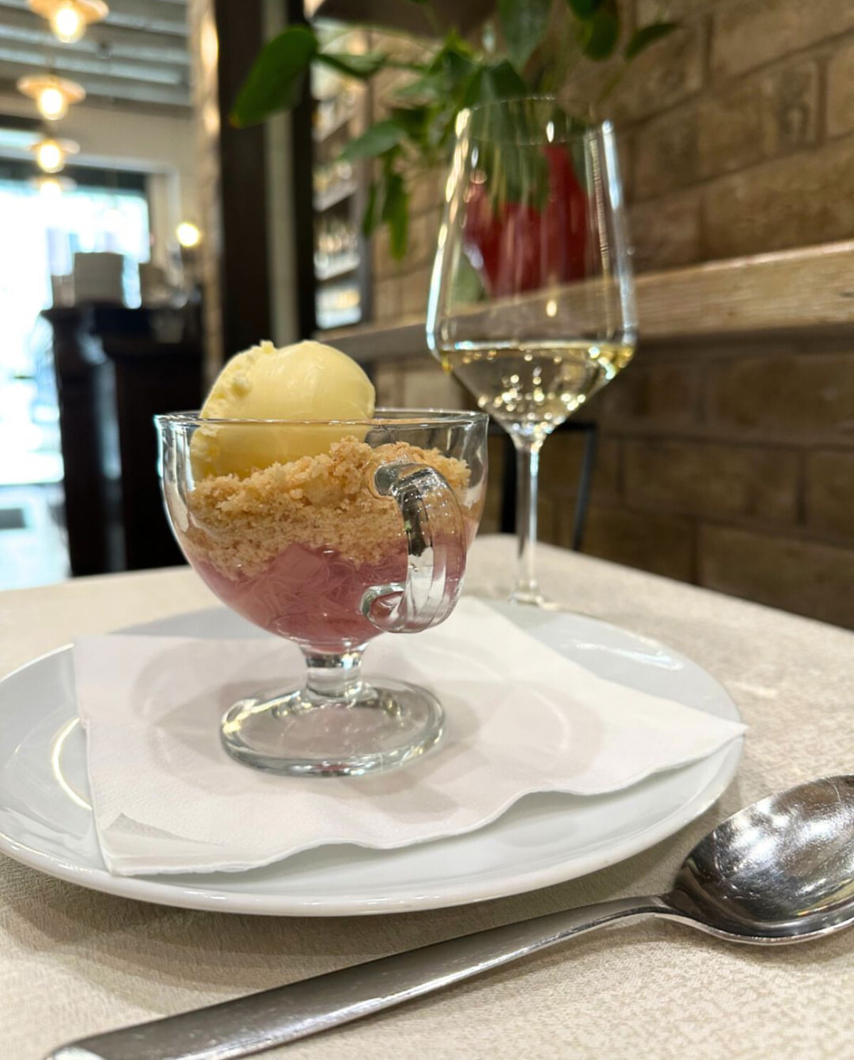 グラスの底のフルーツの鮮やかな赤とクランブルのザクザクした食感、上に乗ったジェラートの濃厚な甘さがとてもマッチしている。白ワインと一緒に食べるとフルーツの酸味や甘さをより感じられる。