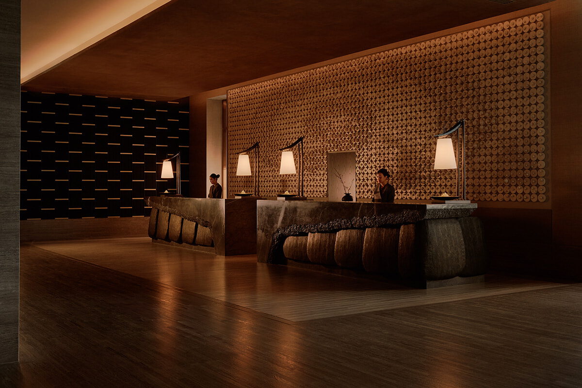 ホテルのエントランス前では、大胆なアートワークと職人技の施された入り口の屋根に見とれ、思わず足を止めました。建築のデザインはアマンをこれまでにいくつか手掛けてきたDennistonを率いるジャン=ミッシェル・ギャシー氏です。客室はスイートが全52室、さらに34室の都市型「アマン ナイラート レジデンス バンコク」が造られています。1階のホテルエントランスに隣り合い、別にレジデンス専用のエントランスも造られています。ホテル入り口からいざ中に入り、エレベーターで9階に上がると、自然光が明るく差し込むアトリウムとレセプションに到着します。