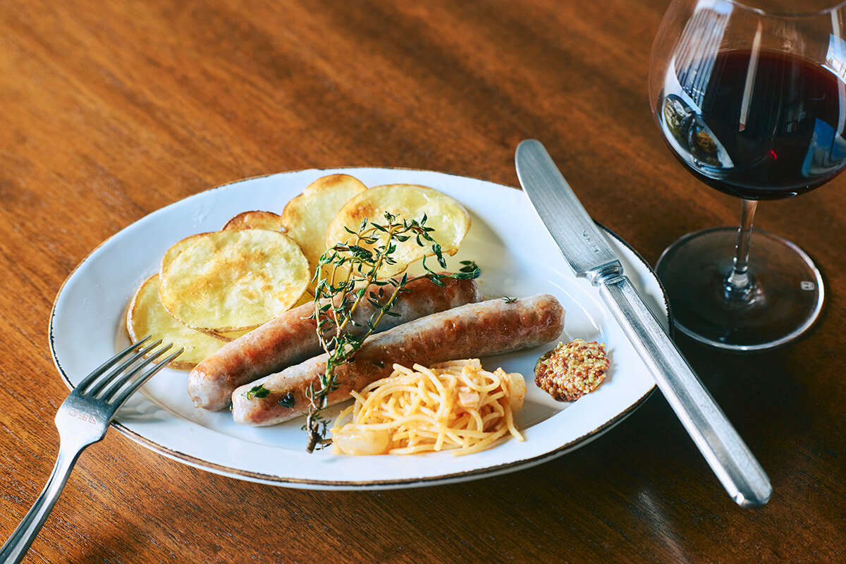 「フランス産シポラタのソテー」¥1,000。豚粗挽き肉の生ソーセージをタイムとともにパリッと焼き上げ、キタアカリのローストとスパゲティサラダを添えて。古樹のガメイから造られた赤とともに。