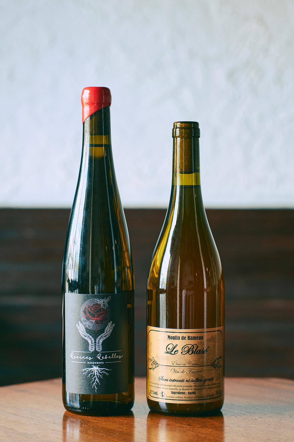 今後が楽しみな、若い造り手による快心の2本。左から、ドイツ・モーゼル地方のリースリングの白「ラシーヌ・レベル/ローゼンベルグ 2020」¥12,000、ヴィオニエとガメイをブレンドしたフランス・オーベルニュ地方の白「ムーラン・ド・ラモー/ブラゼ 2023」¥10,000