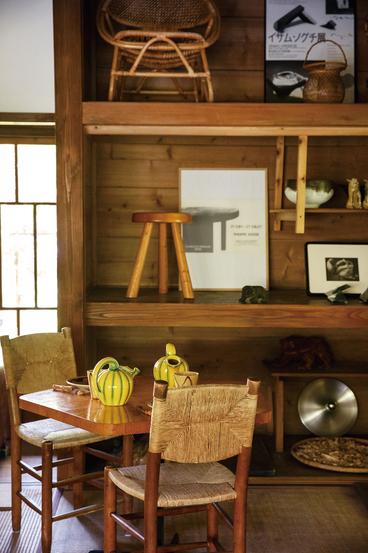 コンパクトな空間に収まるようデザインされたシャルロット・ペリアンのテーブル&チェア。テーブルの上には、ピカソが愛した南仏の陶器の街ヴァロリスで作られたセラミックの作品が置かれる。
