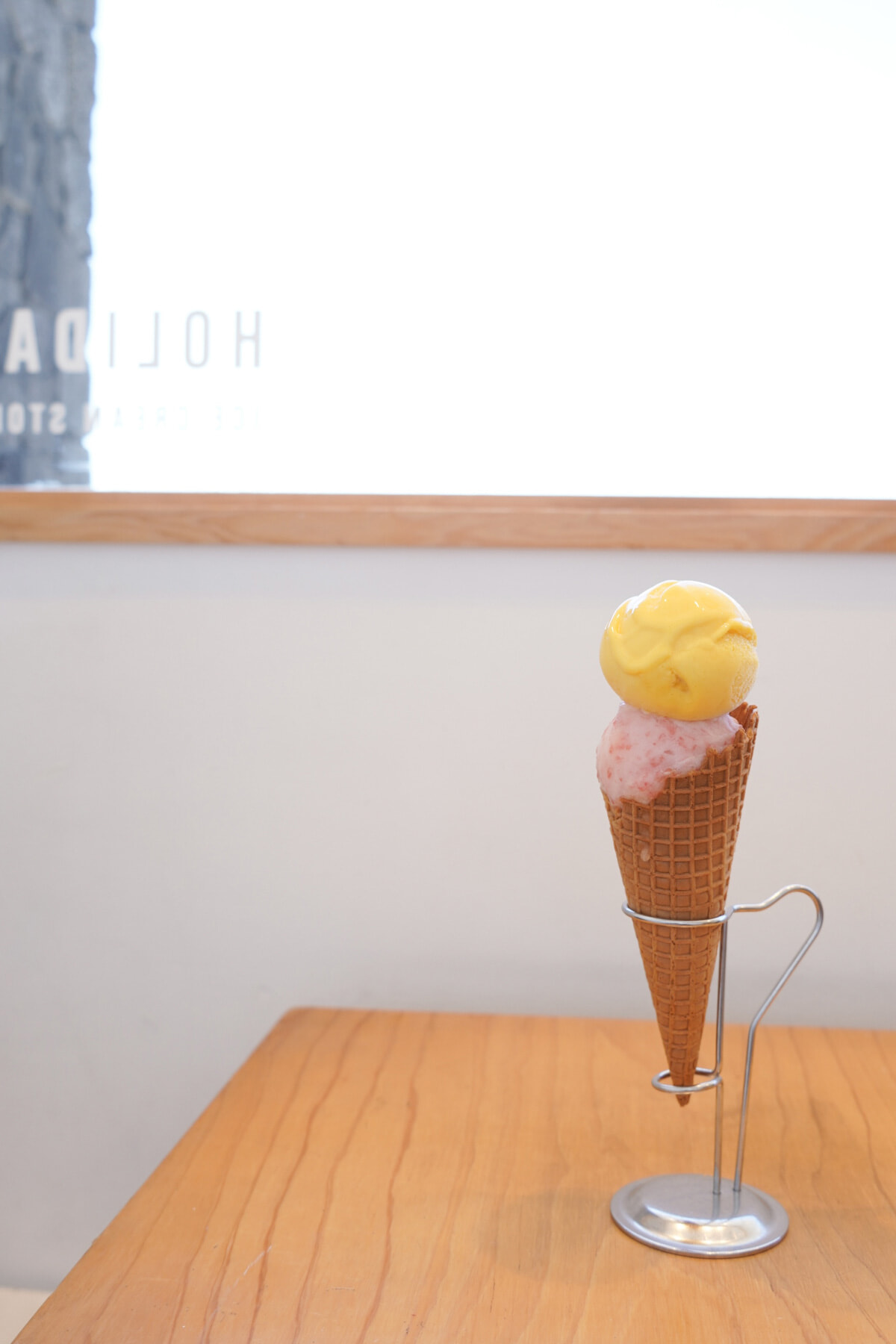 江ノ電に揺られ、海を眺めながら美味しいアイス。ちょっと特別なひと休みを。「チョコミント、ベリー&ベリー」ダブル¥740/HOLIDAY ICE CREAM STORE
