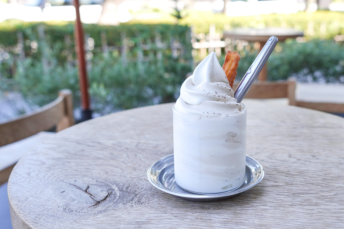 コーヒーソフトクリームは、珈琲豆をエアロプレスで濃いめに抽出したものをブレンドしてつくっている。珈琲豆はその時期によって変化するそう。取材時(7月末)は「HELSAR DE ZARCERO,FINCA ROLA」というコスタリカの豆を使用。イエローハニープロセス由来のフルーティーな香りがアイスクリームにしても感じられる。