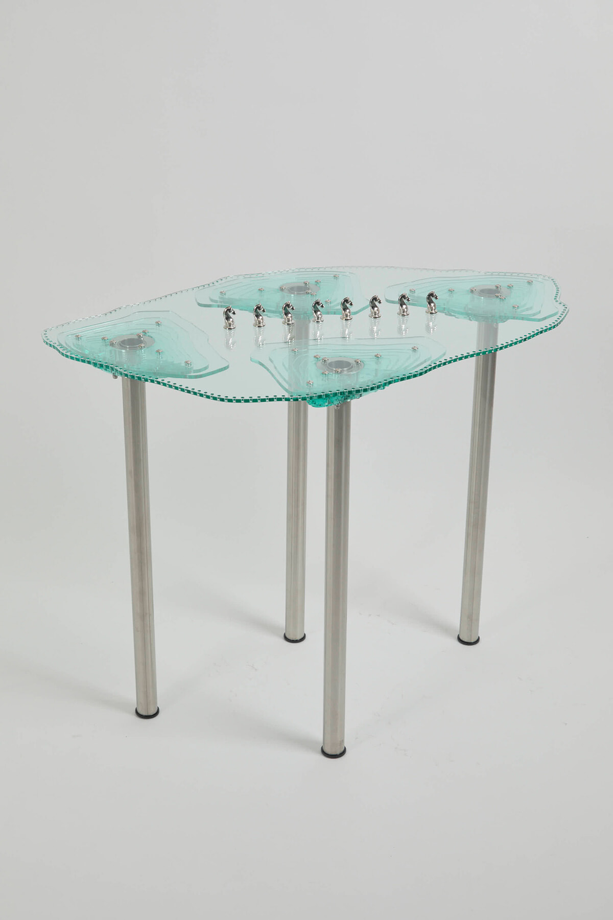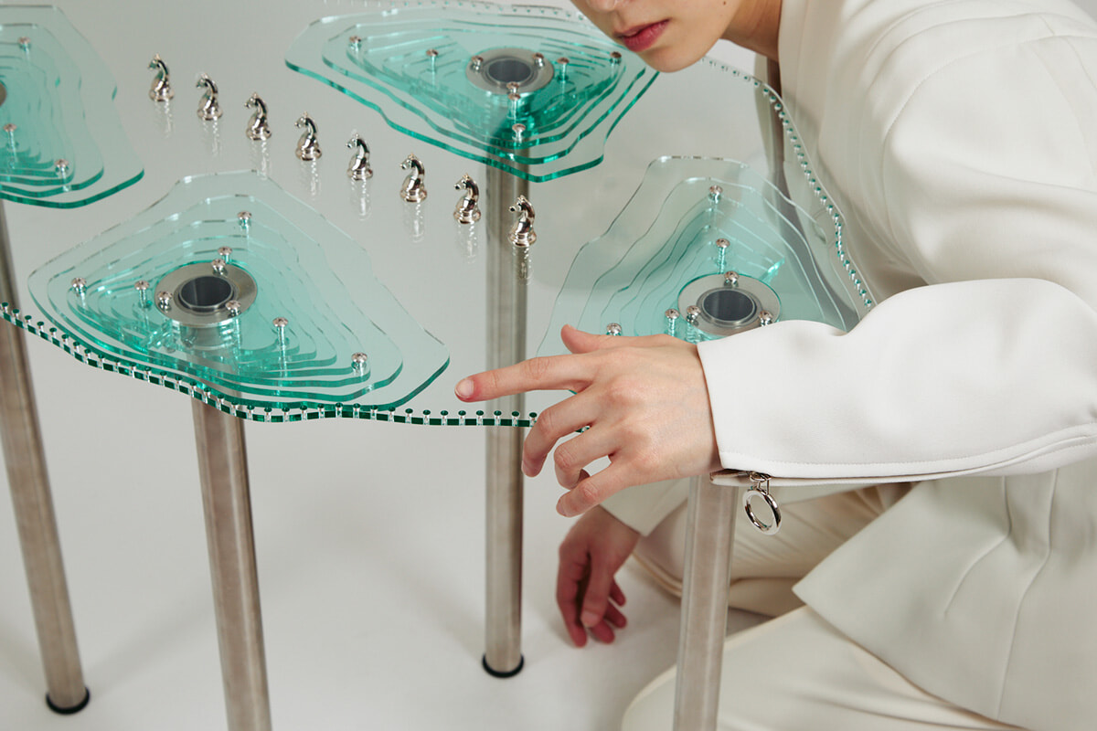 地層や地図における等高線など、自然界の有機的なモチーフを落とし込んだテーブル。クリアカラーのアクリル板を使用し、光の差し方でさまざまな表情の陰影を楽しむことができる。テーブル「ストラタム」(W49×L61×H78cm)¥121,000/ヨウヘイ オオノ *卓上の「チェスの馬」なしのテーブルは¥88,000