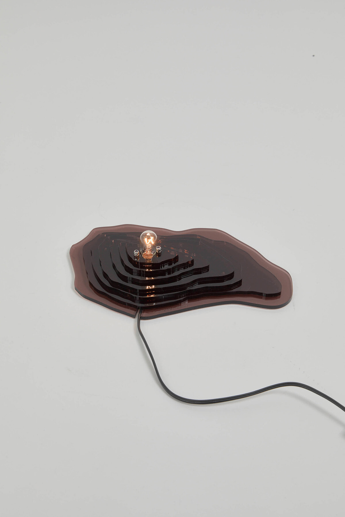 テーブルと同じく地層や地図における等高線をイメージしたデスクランプ。造形は彫刻的でありながら、どこか懐かしい科学キットのような佇まい。インテリアとしての存在感と実験的な遊び心を持ちあわせている。デスクランプ「トポグラフ」(W19×D28×H5cm)¥35,200/ヨウヘイ オオノ