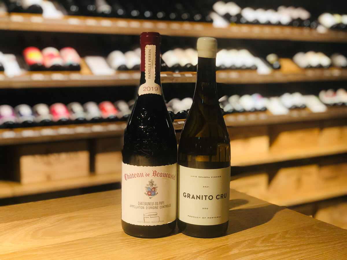 左から、「シャトー・ド・ボーカステル/シャトー・ド・ボーカステル・ルージュ 2019」750ml ¥23,100、「ルイス・セアブラ・ヴィニョス/グラニト・クリュ・ブランコ 2021」750ml ¥8,580