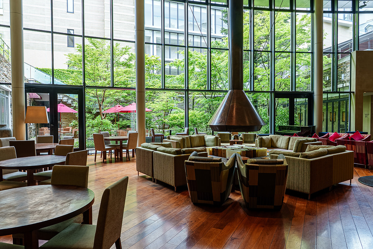 温かみ溢れる居心地の良いサービスとともに、広々とした客室、クオリティーの高い料理や本格的なトリートメントが受けられるスパなど、最上級の寛ぎを提供しているハイアット リージェンシー 箱根 リゾート&スパ。ホテルの中心にあるラウンジ「リビングルーム」では、自然光が降り注ぐ広々とした窓越しに箱根の豊かな緑を感じることができる。