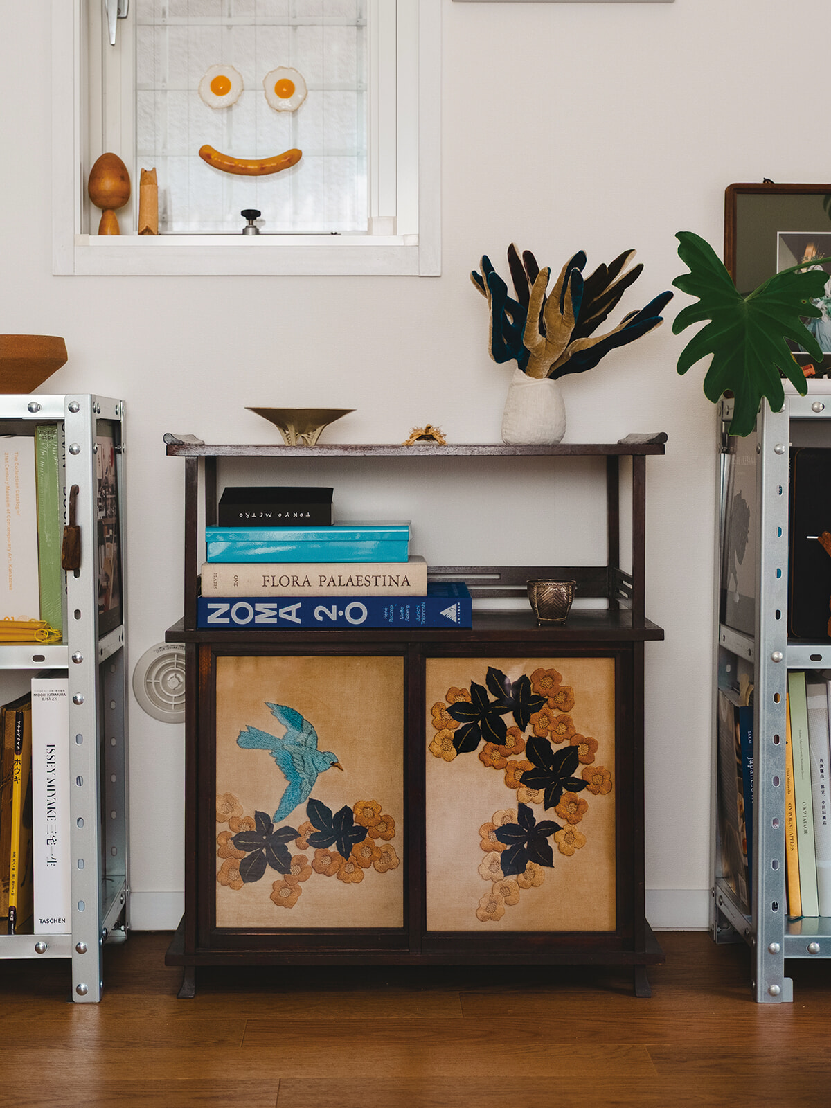骨董市で見つけた戸棚は引き違いの扉部分に細かな刺繍が施されている。窓を飾る大分の美術家・宮崎勇次郎の作品や、戸棚に置かれたニューヨークのテキスタイルアーティスト、タマー・モーゲンドルフのモダンな作品が空間にマッチ。