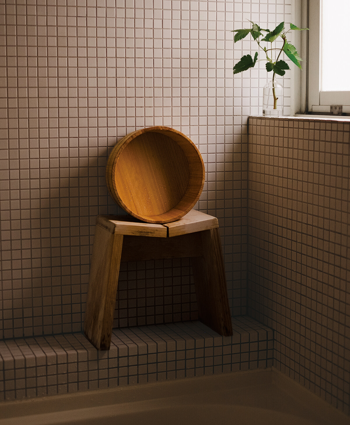 お風呂場には木桶と木の椅子。ふたりは日本の生活道具を使うことに喜びを感じている。