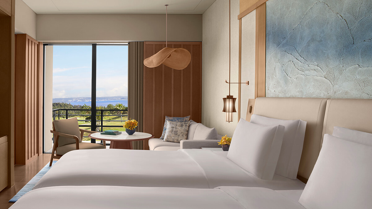 名護湾からの心地よい風がテラスから室内に流れる客室「デラックスツイン」では、エメラルドグリーンに輝く東シナ海と、「かねひで喜瀬カントリークラブ」の緑豊かなゴルフコースが眼下に広がる。