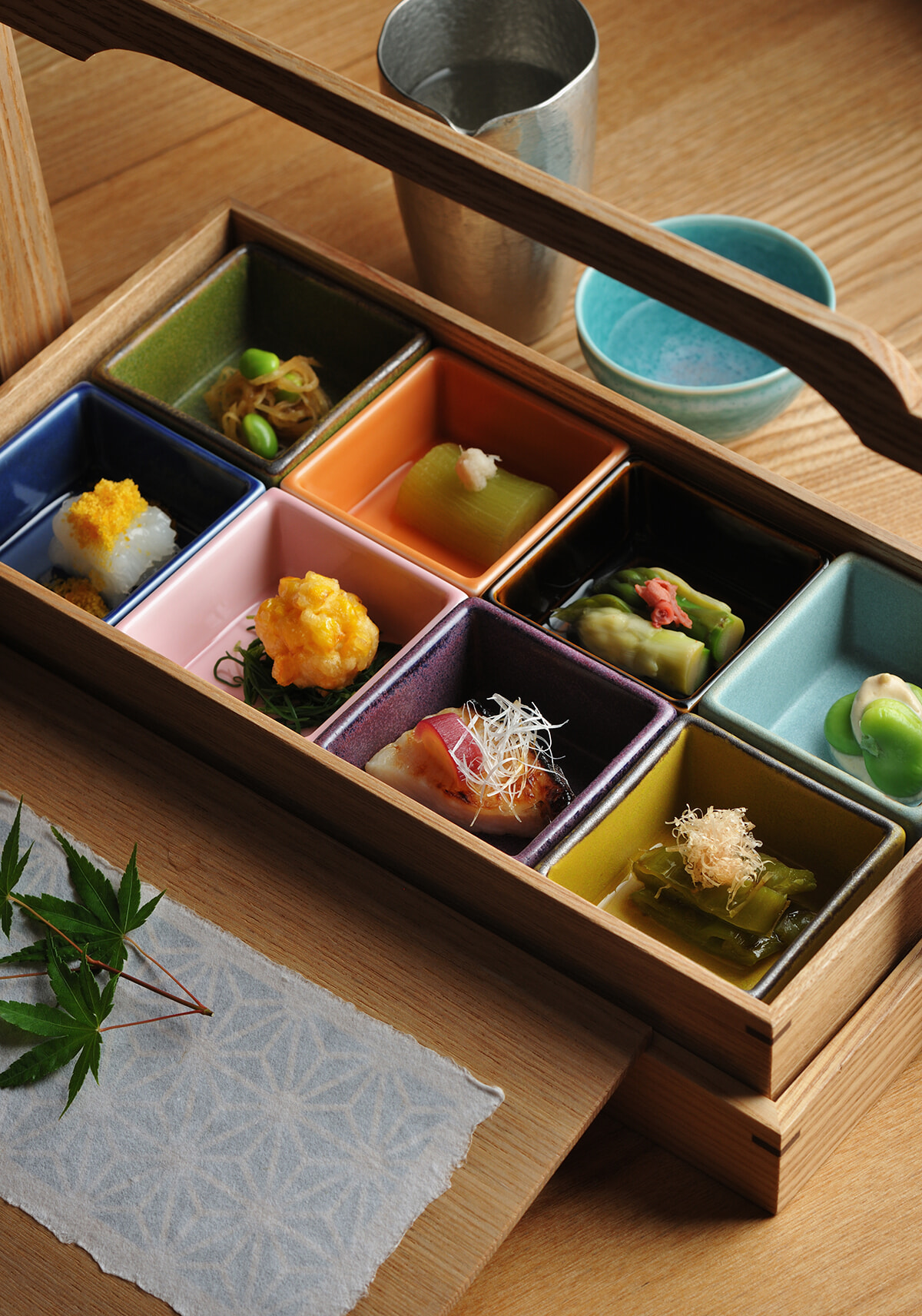 料理はすべて夜のコース¥14,850より。旬菜籠盛り。新ショウガのきんぴらと枝豆山椒煮、翡翠ナス、アスパラの酒盗がけ、天豆白和え、万願寺唐辛子焼き浸し、銀ダラ西京焼きなど、日替わり8種の盛り合わせ。日本酒1合¥1,200~