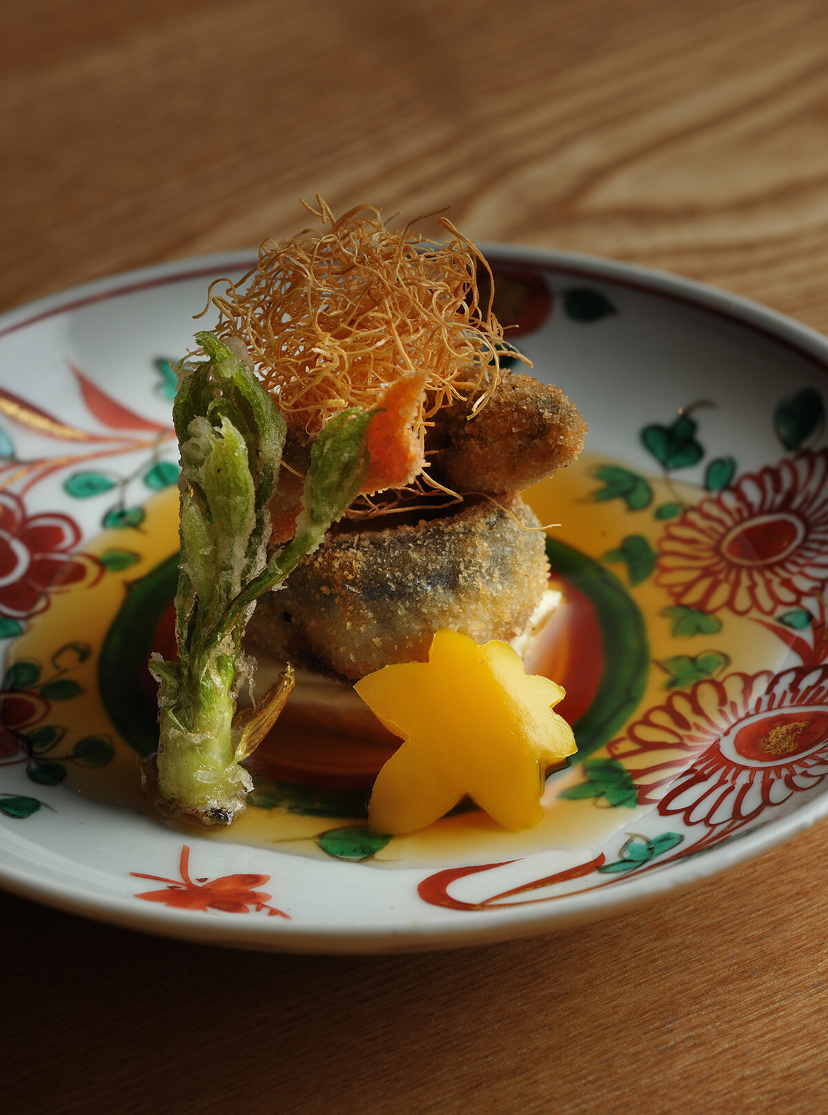「琵琶湖の小アユと琥珀餡」。湯葉、コシアブラ、千切りゴボウの素揚げを添えて。うつわは永楽妙全作の赤絵福字中皿。ランチ¥5,500~