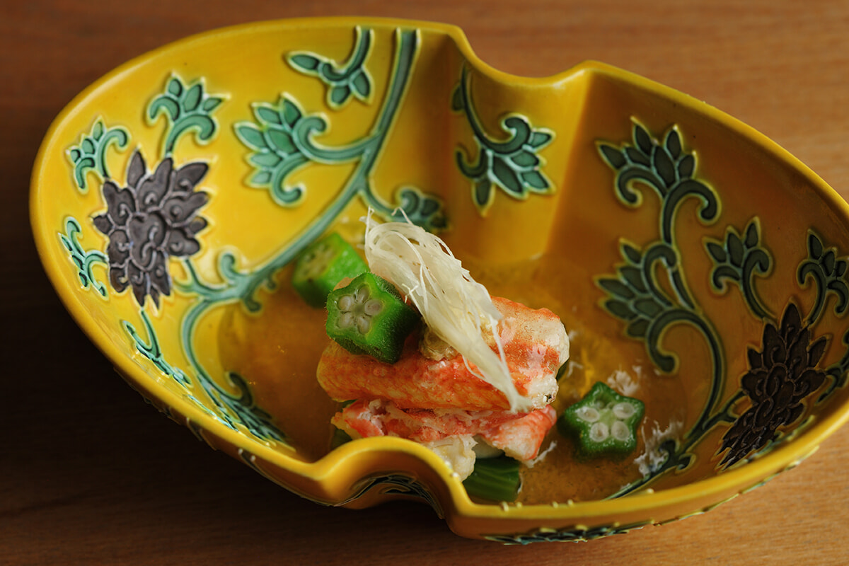「毛蟹 土佐酢ゼリーがけ」。うつわは15代永楽正全作の黄交趾分銅形向付。