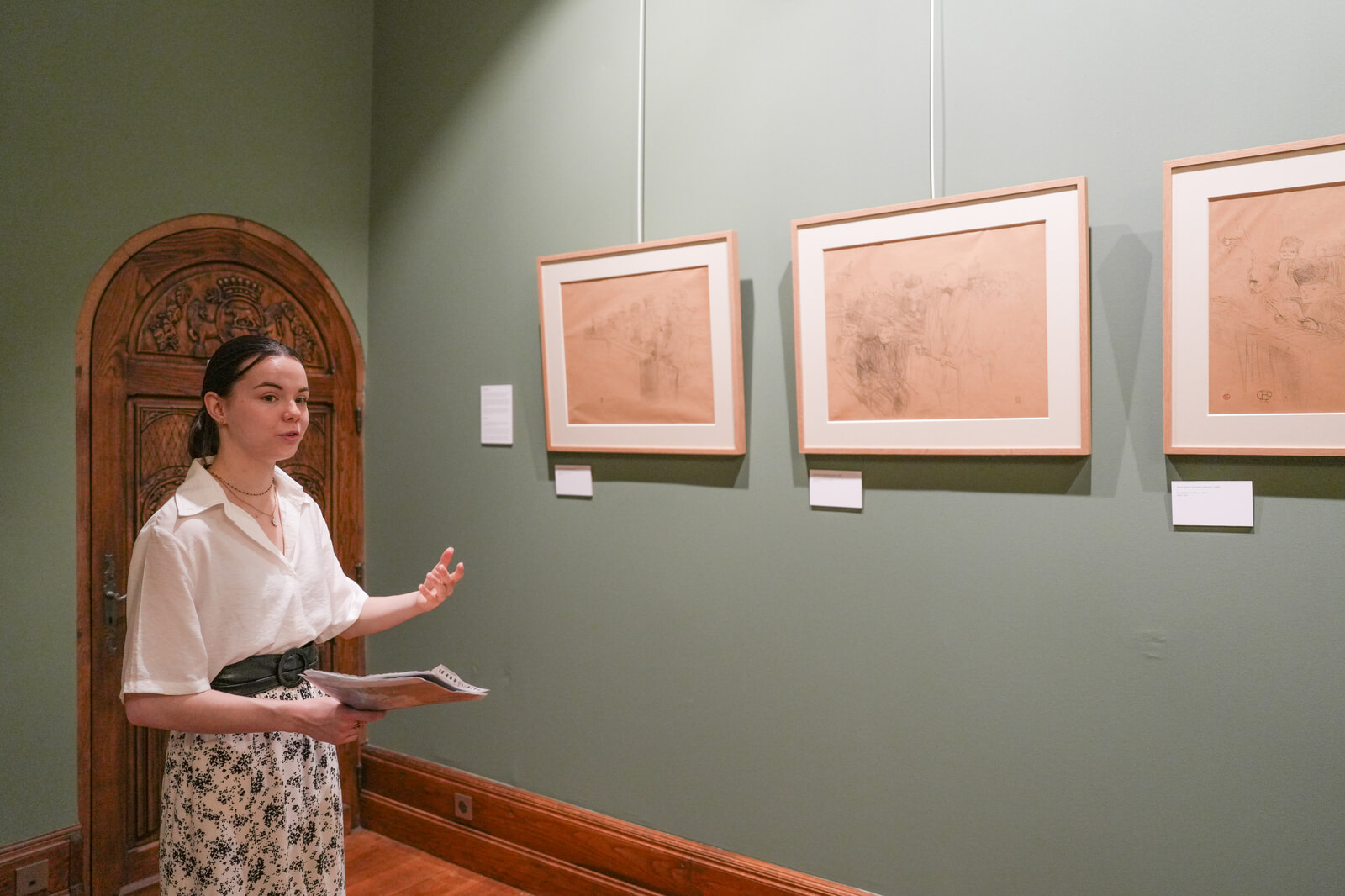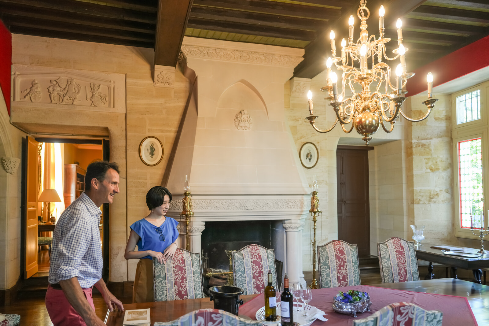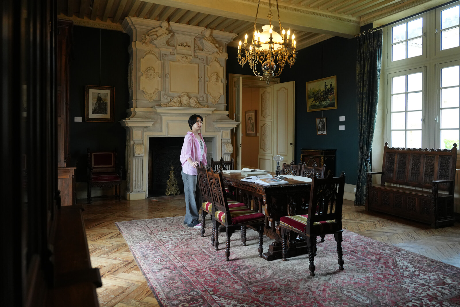 ガイド付きツアーに参加し、シャトーのサロンを見学する松本さん。シャトー内には素描画、ポスター、リトグラフなど30余りのロートレック作品が展示されている。