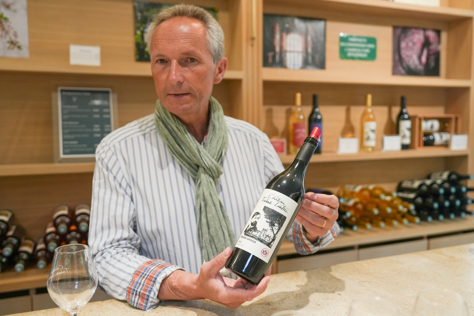 ラベルにシャトーとアンリ・ド・トゥールーズ・ロートレックの肖像が描かれた、主力ワインの「シャトー・トゥールーズ・ロートレック」の赤を手にもつシャルル・エスタジェ。