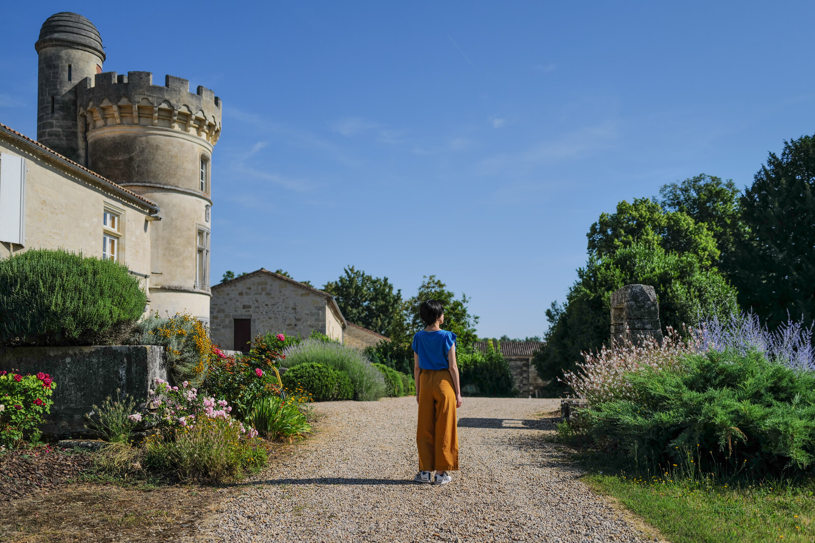 「メドック方面の平坦な道ではなく、丘が連なった抑揚のあるアントゥル・ドゥ・メールの道をドライブしているとテロワールの違いをよく理解できる。この丘の日当たりの良さや少し谷になった所を抜ける風が良い畑、ブドウ造りに影響するのだと思いました。本当にバランスが良くて、この旅で味わった中ではいちばん、自分の知っているボルドーブランに近い味わいだったと思います。少しだけ青い香りがあって、でもピンクグレープフルーツやマイヤーレモンのような甘味のある香り。きりっとした酸味と青りんご、白い花のようなフレッシュさ、心地よく口内で同調してくれる粘性。この日のランチに出たトマトとハーブのサラダにぴったりで、真夏のボルドーの気候にいかにぴったりのワインかを身をもって体感することが出来ました」