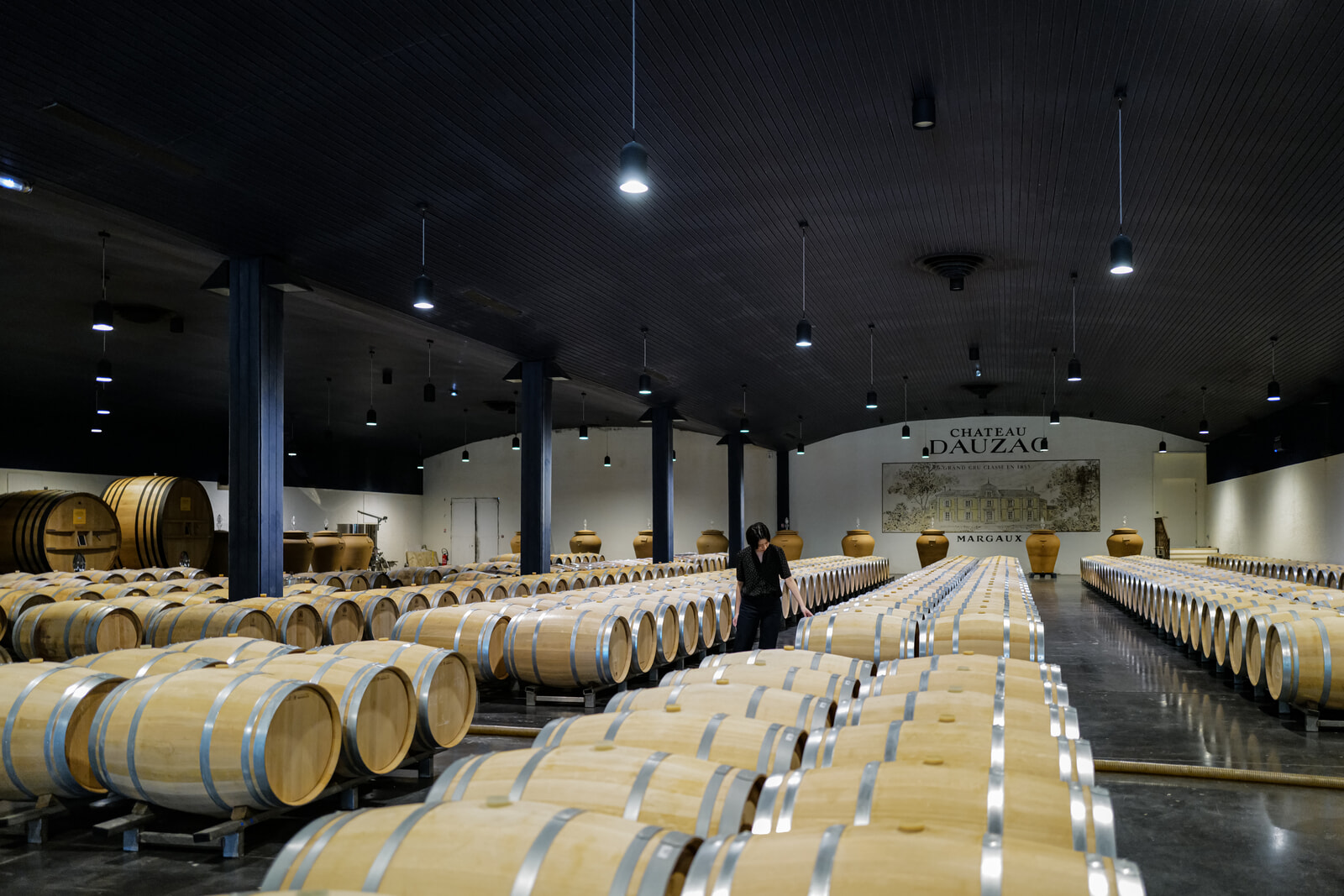 バリック(熟成用のオークの小樽)が並ぶセラーを見学する松本。