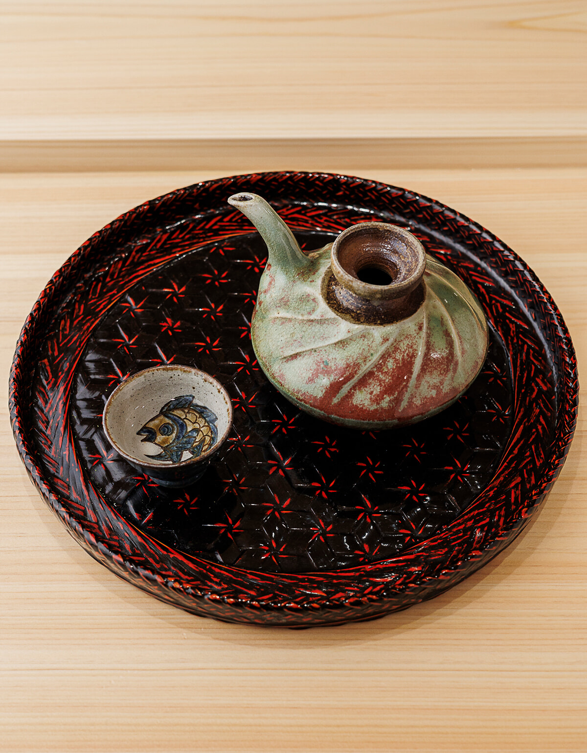 つまみに合わせて供する泡盛の古酒は石垣島の伝統的な川平焼、凛火のカラカラで。沖縄出身の女将のセレクト。ペアリングは7杯¥7,700