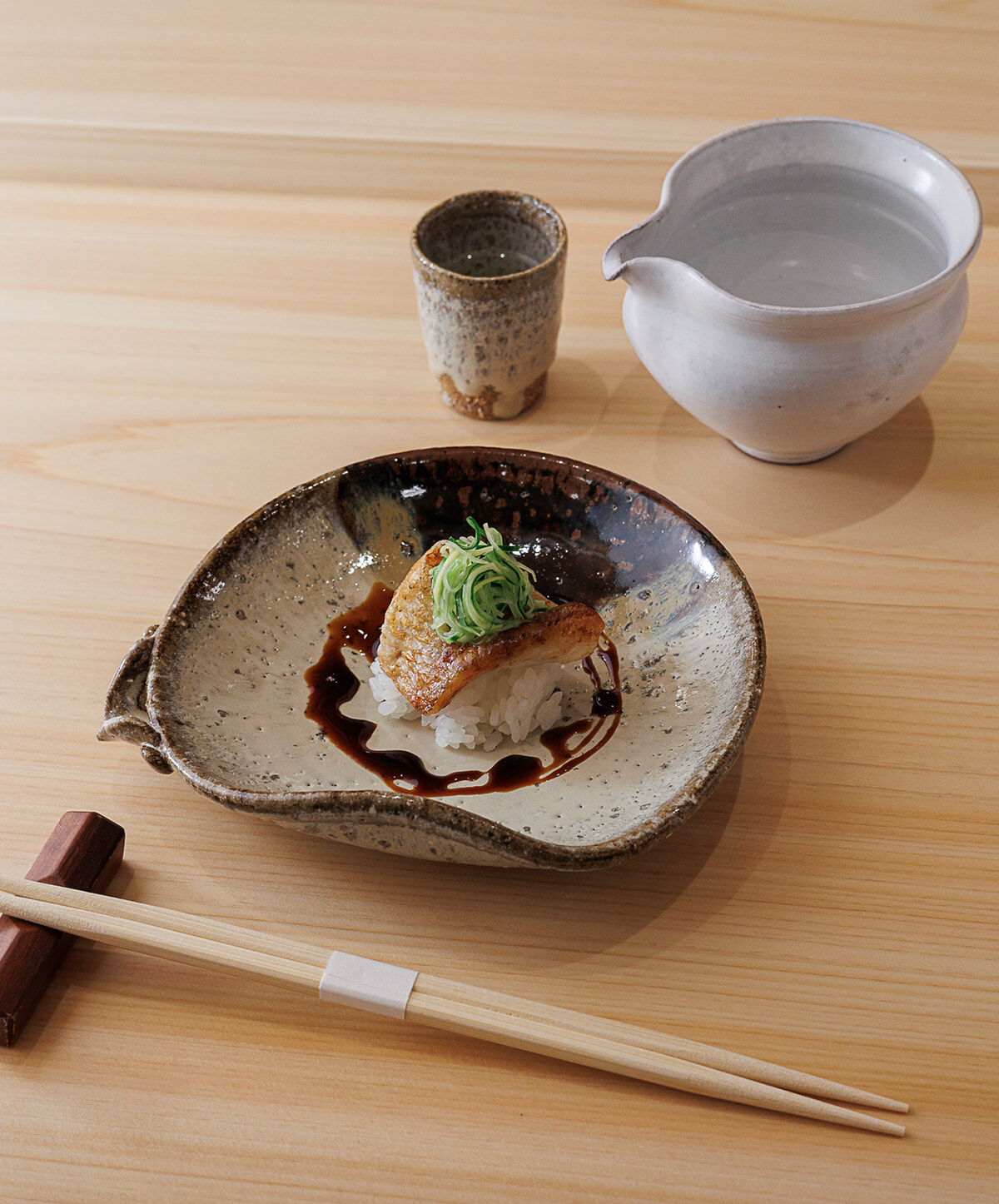 付け台に置かれた皿も唐津焼。おおらかな作風の藤ノ木陽太郎の作品。料理はすべて¥27,500のコースから。握りは左から、やま幸から仕入れるマグロの中トロ、コハダ、ナガスクジラ。