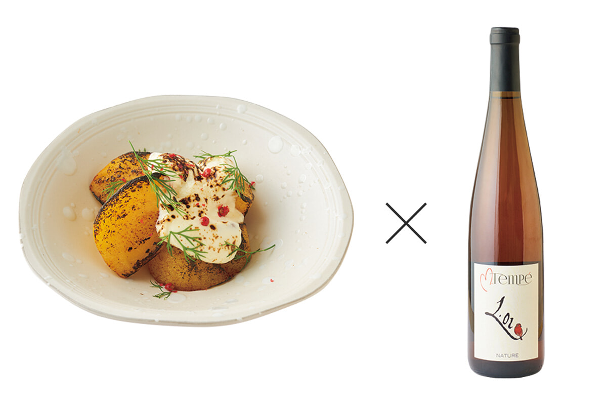 「焼き柿とマスカルポーネ」¥750。焼くことで甘みが増した富有柿に、クリーミーなマスカルポーネをとろり。上に散らしたピンクペッパーとディルが彩りを添える。ピノ・ブランとピノ・グリ主体のロゼ「マルク・テンペ/MTヴァン L.01 クルール・コライユ NV」¥7,000と。