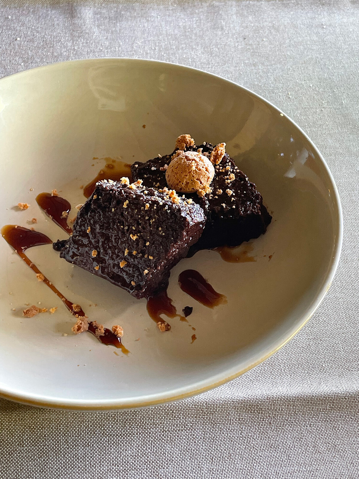 トリノ名物、チョコレート風味のココアプリン「ボネ」。杏仁を含むビスケット「アマレッティ」を砕き入れるのが特徴。