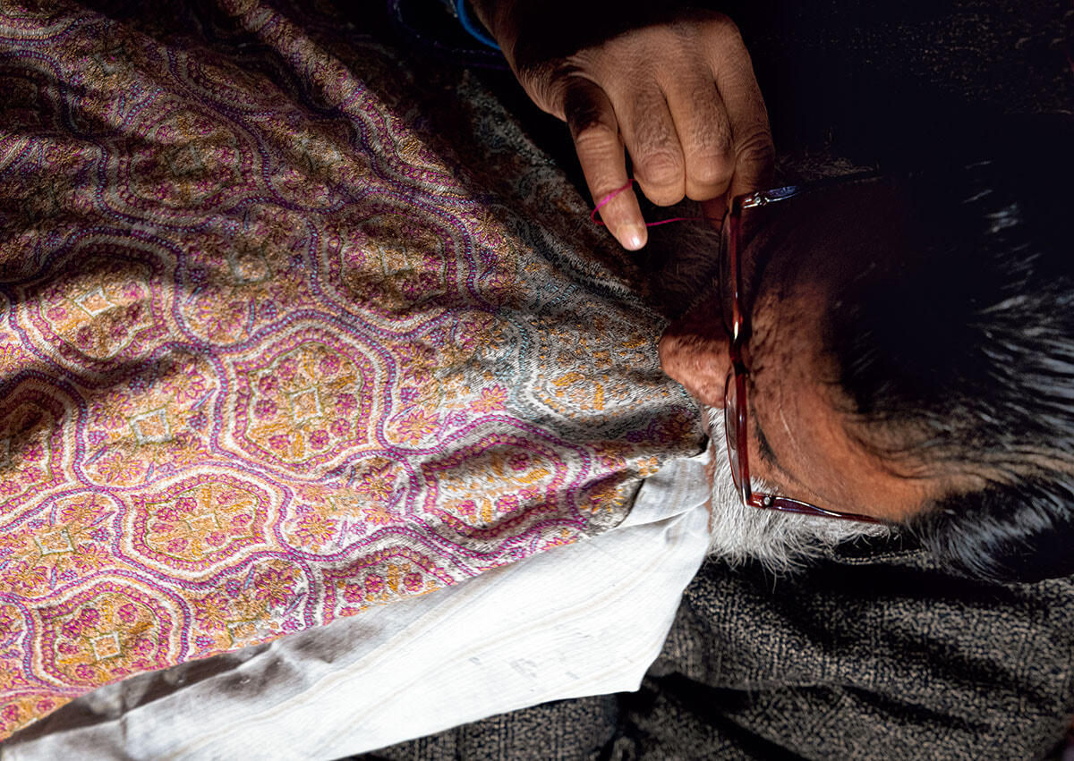 インドのジャンムー・カシミール州シュリーナガルは30年以上憧れ続けた街だ。仕事で月に一度はインドを訪れていた社会人一年生の頃、イタリア人の同僚たちが彼の地で買い求め自慢していたのが、細密な刺繍が施された、とろけそうに柔らかなカシミールのショールだった。刺繍のモチーフは幾何学模様やペイズリーをデフォルメしたもので、細部や色使いは可憐極まりないのに、その中に隠しようのない凄みが宿っていた。当時の私には高価で手が出る代物ではなく、「身に着けられる美」をいつか手に入れたいと思った。素晴らしい刺繍は男性の職人の仕事だと後に知った。大きな手で小さな針を動かし紋様を描く様子を撮りたいと願いながらも、長い間、渡航規制があったので機会を探っていた。