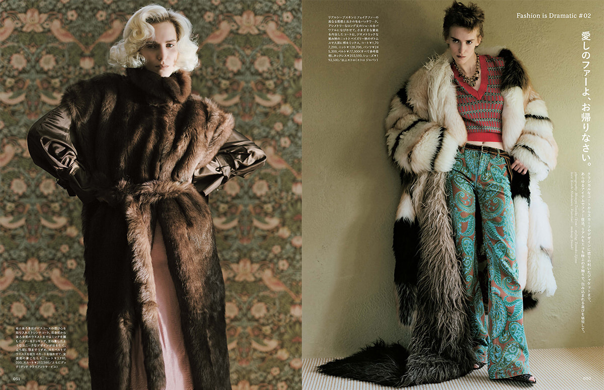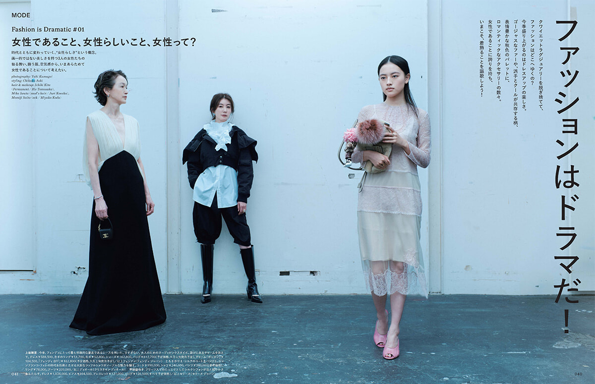 巻頭特集は「ファッションはドラマだ!」。そうです、服を着て、誰もが自分自身のドラマを語り続けなければ。冒頭は意志的な俳優3人の女性たちに登場していただきました。年代を変えて、女性が美しく成長していく過程を魅せるかのように表現しています。甲田益也子さん、ともさかりえさん、上坂樹里さん、それぞれの世代の美のモードがあります。