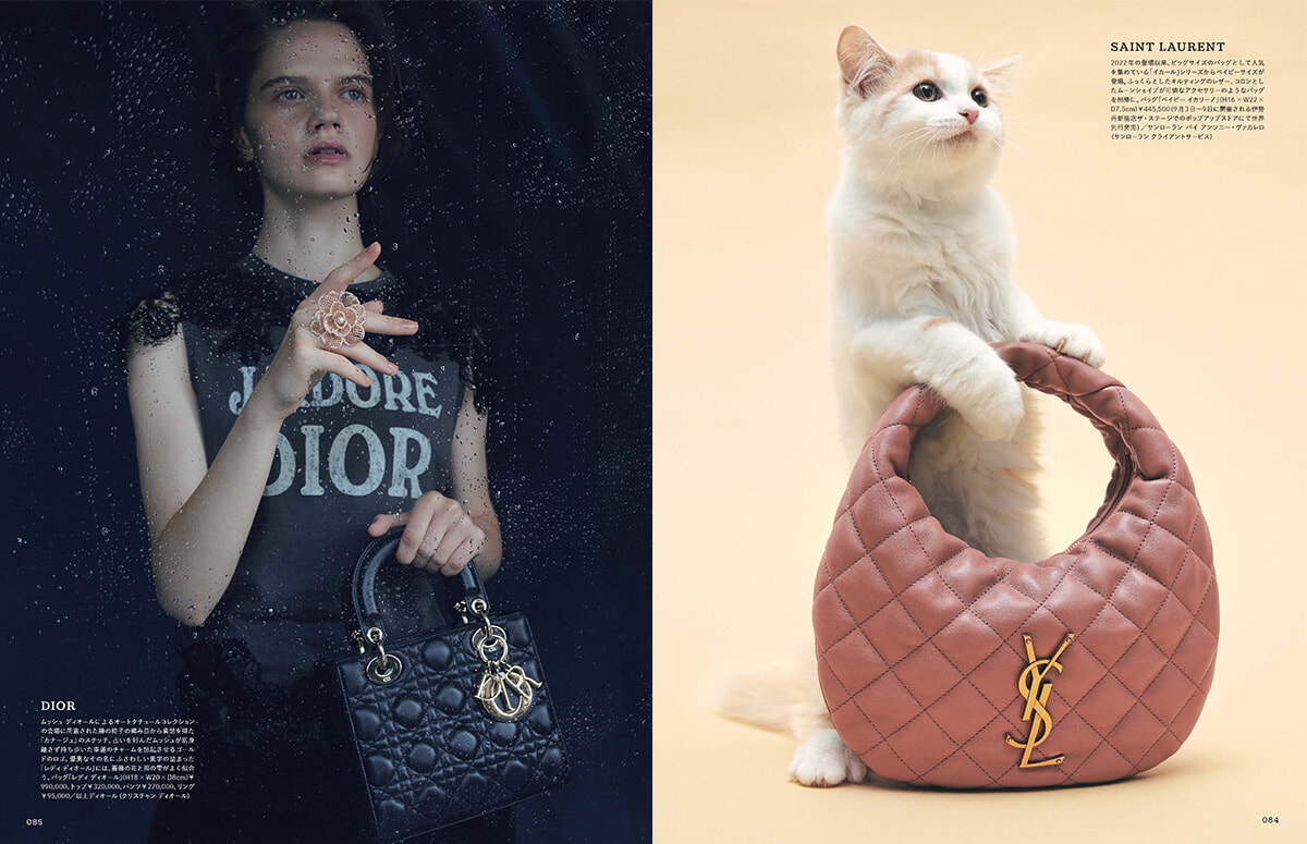 ファッションの立ち上がりシーズンには、必ずアクセサリーにフォーカスするテーマを設けますが、今回もシューズ&バッグでは特に人気メゾンのアイコンバッグに注目しました。こちらは人間のモデルと猫モデルが同じポーズを取ることを意識した、と編集担当が言っておりました……。