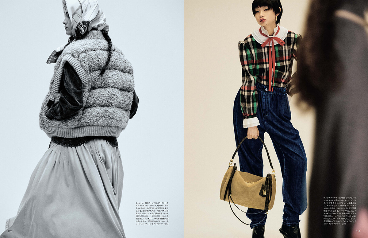 今号はルイ・ヴィトンに関して、プレタポルテの秋冬ファッション、パット・マクグラスの手により完成したラ・ボーテ ルイ・ヴィトン、大阪中之島美術館の『ビジョナリー・ジャーニー』展と、ブランドの持つ世界観を多方面で掲載しました。この秋冬の「旅」というメゾンのDNAに言及したプレタポルテはコーディネートも愛らしく、地球上のさまざまな人たちが行きかう「駅」がテーマのひとつにもなっていて大好きだったので、そのページもちらり。