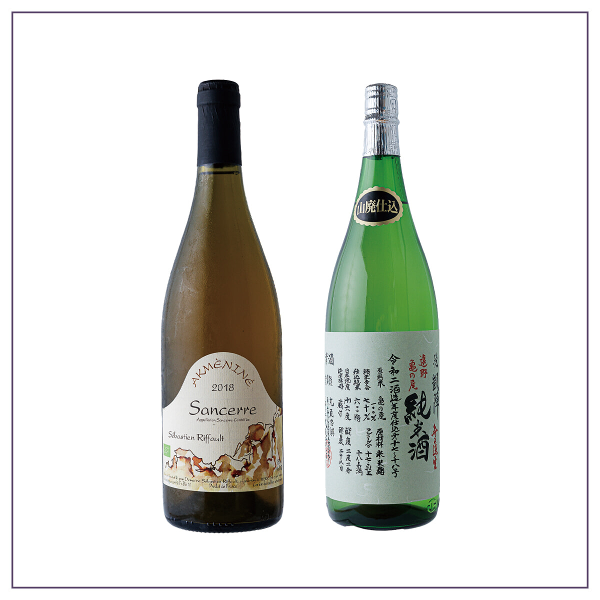 左:「セバスチャン・リフォー/サンセール 2018」グラス¥1,430。化学肥料などを用いないビオディナミ製法。生き生きとしたミネラル感とアンズのようなニュアンスも。 右:「悦凱陣 純米酒 R2BY」1合¥1,980。昔ながらの和釜と木製の甑(こしき)を使った酒造りで人気。燗酒にすると米のふくよかな旨味がいっそうふくらむ。旬魚を使ったつまみとの相性はいわずもがなだが、油気の多い料理にも。