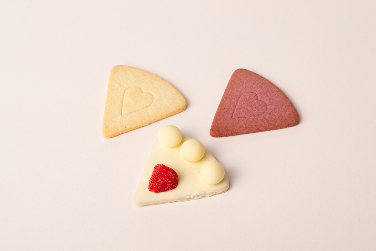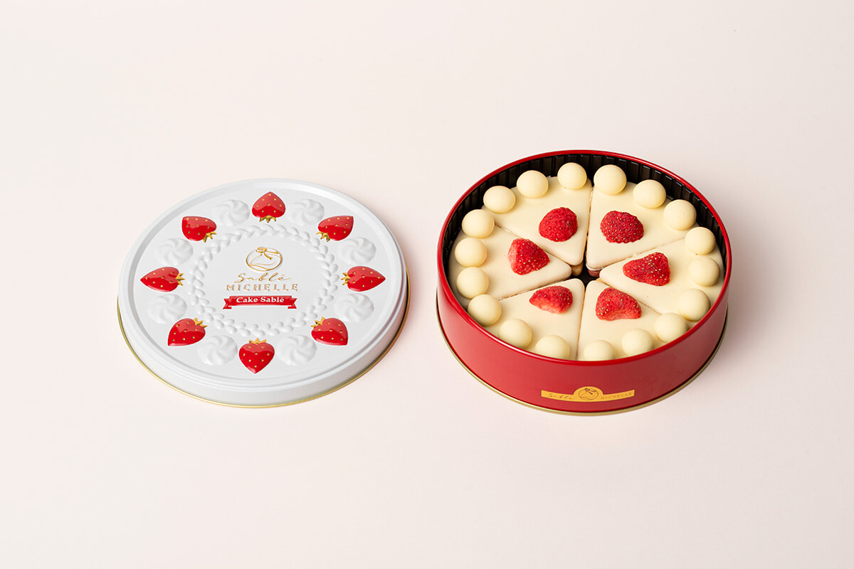 そんなサブレミシェルを代表するのが、缶もサブレもまるごと、苺のショートケーキにみたてた「ケーキサブレ缶」。上段には、ホワイトチョコレートでコーティングした三角形のサブレに、フリーズドライのいちごと、さっくり食感のチョコボールをのせた、ショートケーキ型が。下段には、バターといちごのシンプルな型抜きサブレが詰め込まれている。