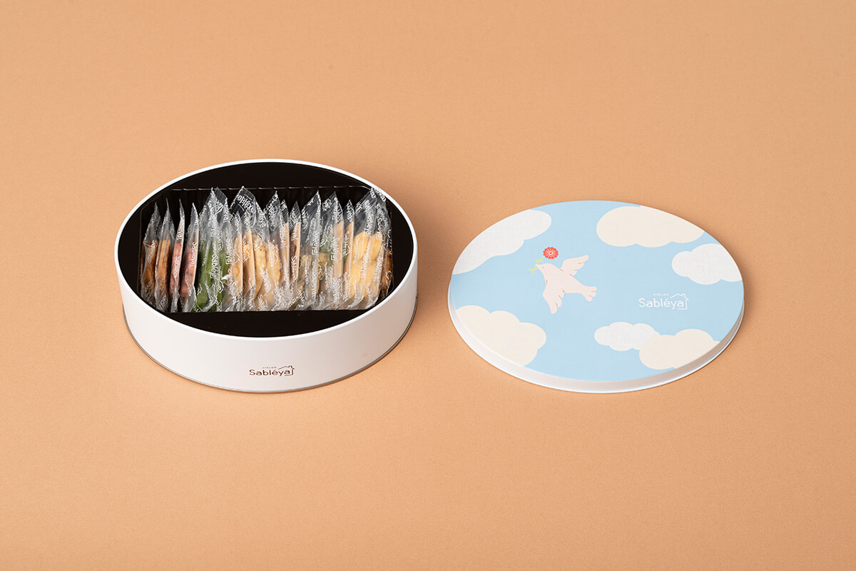 そんな定番のサブレ9種類を詰め合わせたのが「アトリエオーバル缶」。青く晴れ渡った空にサブレヤの象徴でもある羽ばたく鳥がデザインされた、長円形の缶も愛らしい。それぞれ個包装されているので、差し入れを要する場の手土産に選んで、一枚ずつ配ることができるので重宝している。