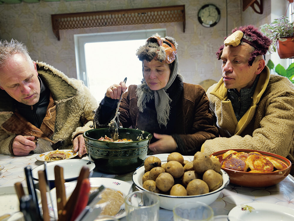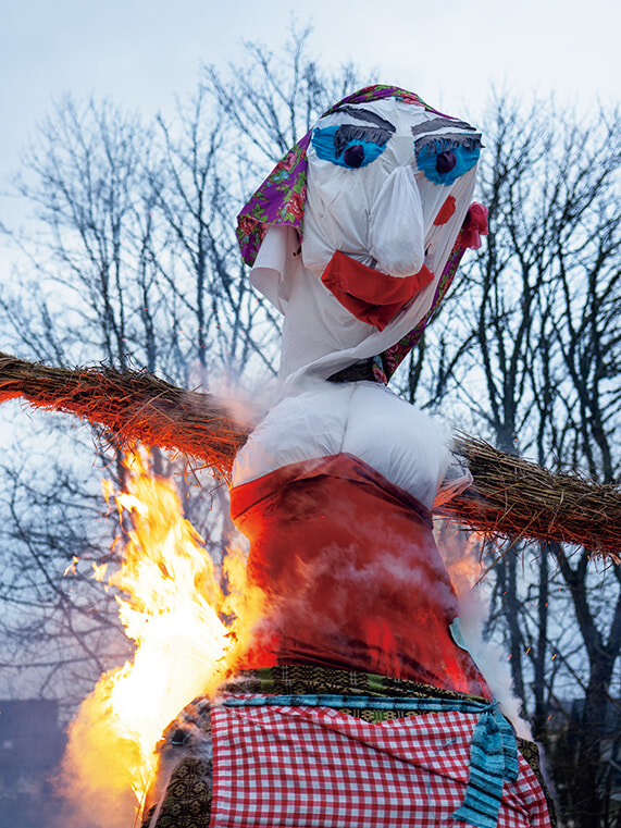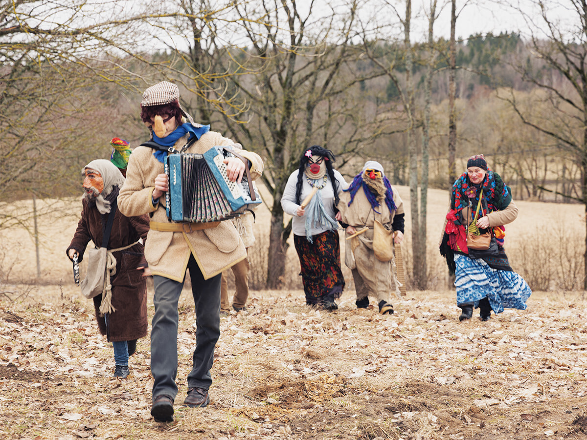 越冬祭ウジュガヴェネスを撮りたくて、祭りのタイミングにあわせてリトアニア北西部、ジェマイティヤ地方のプルンゲを訪れた。獣を模した面をつけて家々を回るスタイルが、日本の節分やナマハゲにも似ていて興味惹かれたのだ。毎年イースターから数えて7週間前の火曜日におこなわれるウジュガヴェネス。夏にプルンゲを訪れた時、地元の人たちから「ウジュガヴェネスを見たいならここに来なくちゃね!」と何度も言われていた。ジェマイティヤ地方はリトアニアの中でも、独自の文化や言語が残っていて、人々の地元愛が殊更に強い。そんな地域だけに祭りにかける人々の熱量もかなりのものだ。欧州内でキリスト教が広まる中、土着の自然崇拝の信仰がいちばん最後まで残ったのがジェマイティヤ地方で、ウジュガヴェネスもその精神を折々に垣間見る祭りだ。獣や魔女の仮装をした一団が歌い踊りながら家々を巡り、パンケーキや肉料理、酒などのご馳走をねだる。家人が一団にそれを振る舞うと、彼らは決まり文句の「冬よ、冬よ、ここから出ていっておくれ!」と声を揃える。仮装した一団に朝から夕方まで同行して、このおもしろい大人たちの活躍ぶりを撮影した時間は何とも楽しく、田園風景や家々の様子も相まって、まるで民話の世界に入り込んだようだった。祭りのクライマックスは、冬の化身であるモーレの大きな人形を焚き上げ、春を受け入れる準備が整う。春よ春よ、どうぞこちらにいらしてください。