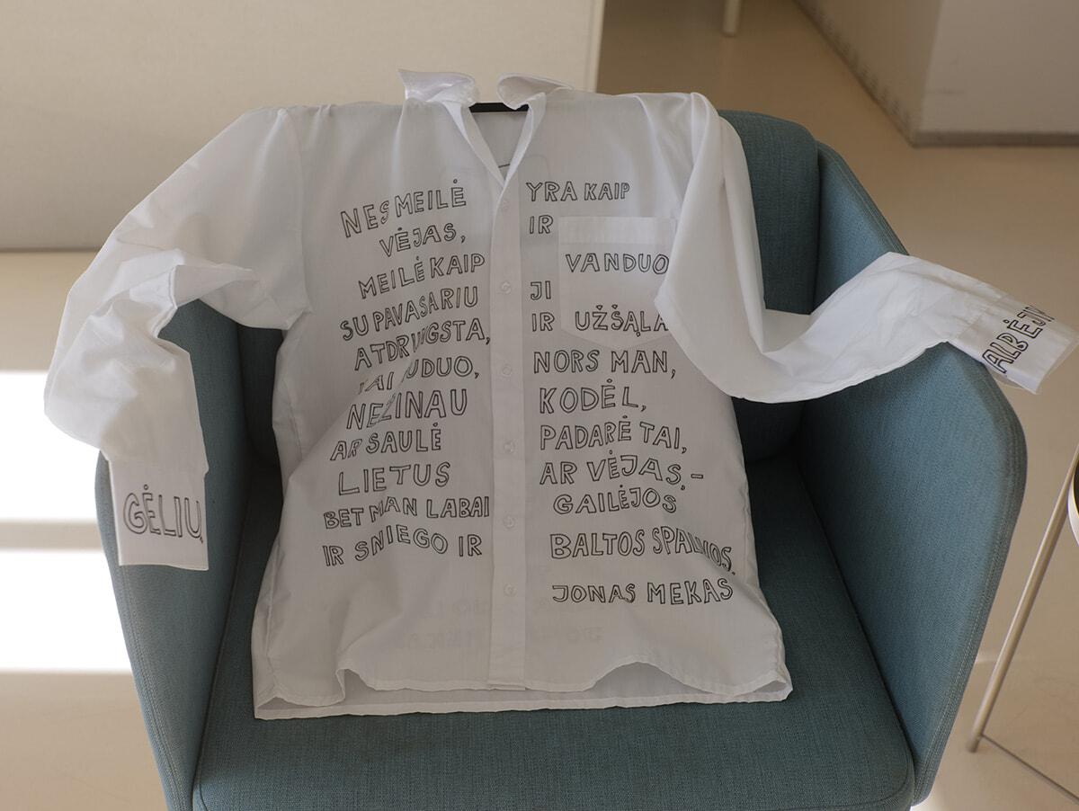 湖の袂のしゃれたカフェにはメカスの詩をデザインしたシャツが展示されていた。詩集『森の中で』の中で読んだ言葉を思い出した。メカスの言葉は近くにある自然と人の心とともにある。メカスの映像作品は私がリトアニアに関心を寄せるきっかけになったが、いまはメカスは「伝わる言葉」を持った人だとも感じる。
