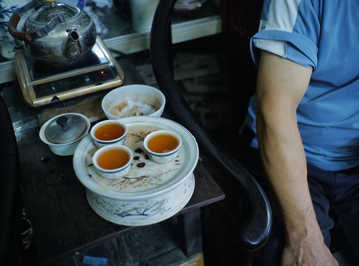 街角の商店では必ずと言っていいほどきちんと茶盤と茶器を使って、働く人々がお茶を楽しんでいる。小さな骨董屋の店先で。