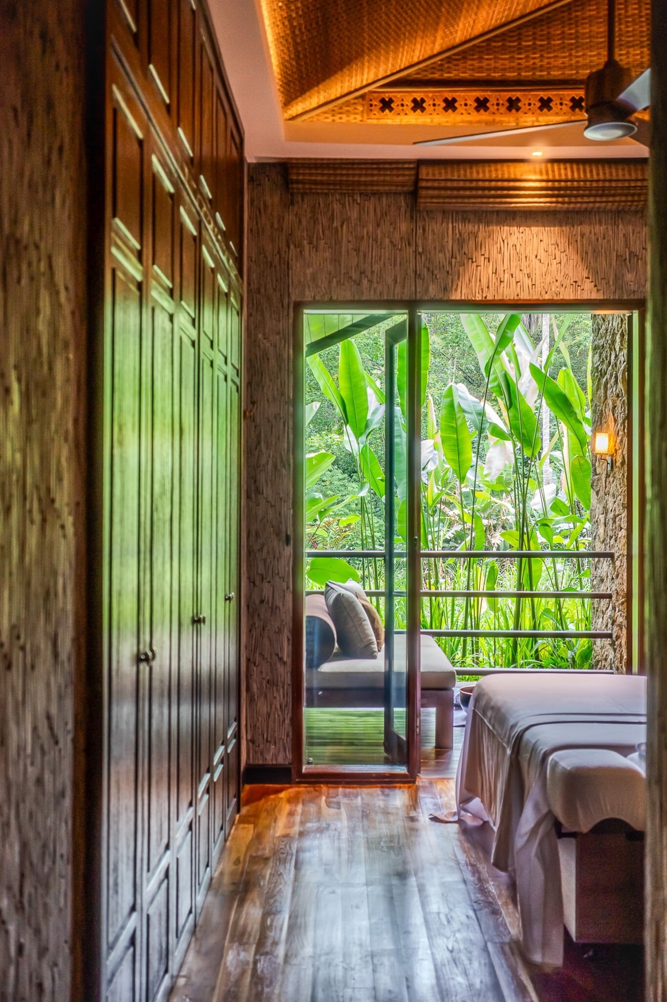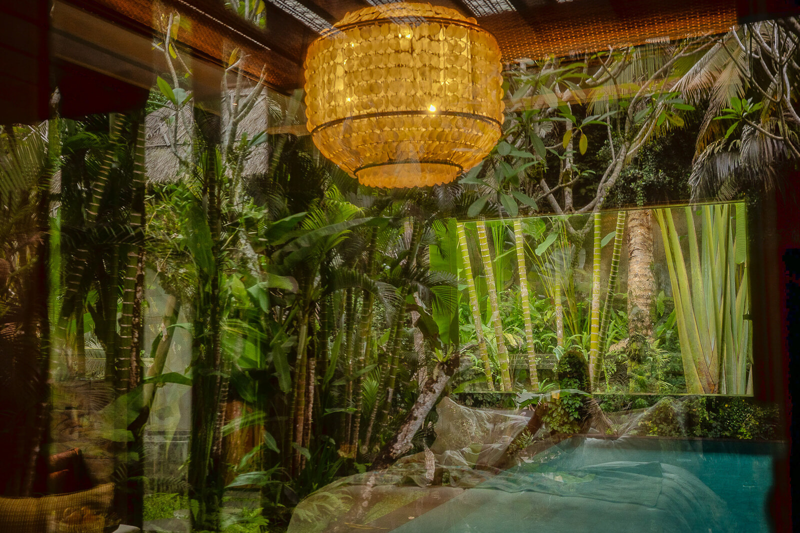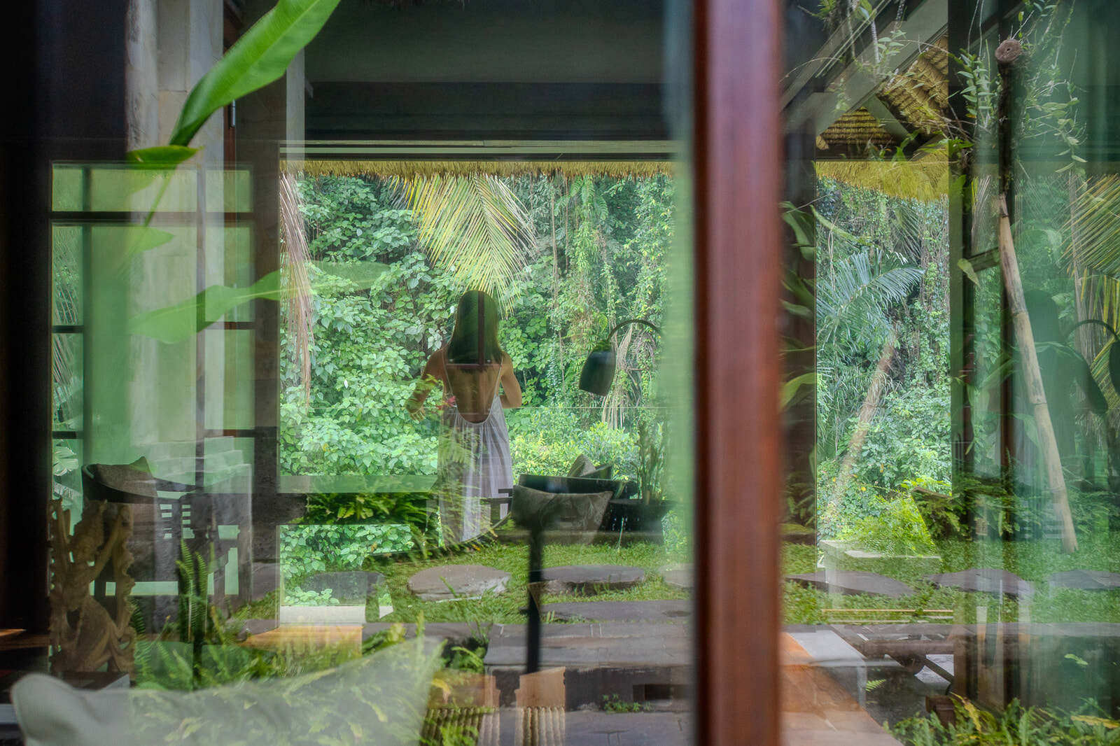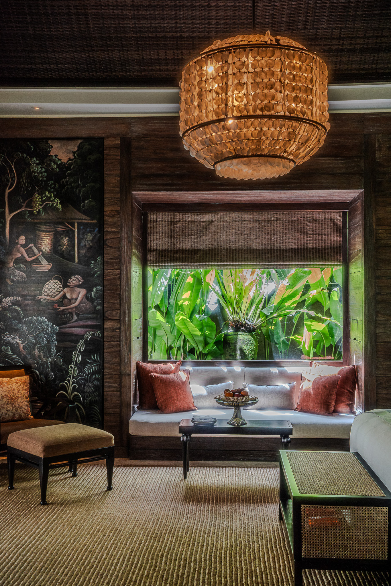 室内はバリの伝統様式をベースに、モダンなインテリアを組み合わせた重厚感のあるシックなデザイン。窓越しに広がる緑が、空間に柔らかな陰影を落とす。