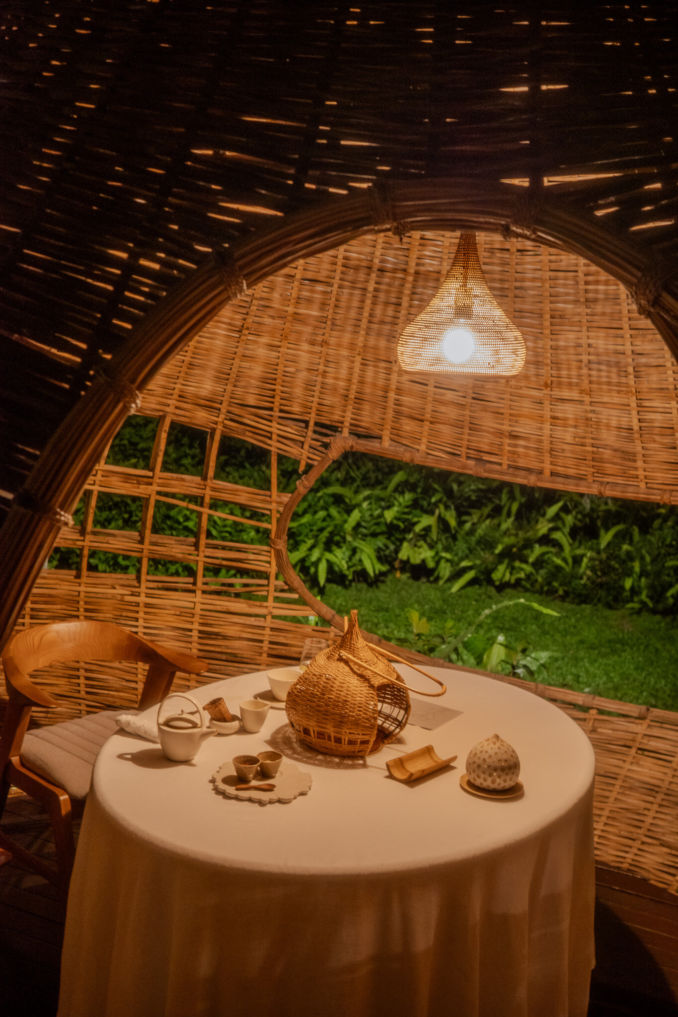 ディナーは「クブ」。竹で編まれたコクーン型の個室でいただくコース料理は、まるで秘密の晩餐。最後に登場した愛らしいデザートに、思わず笑みがこぼれる。