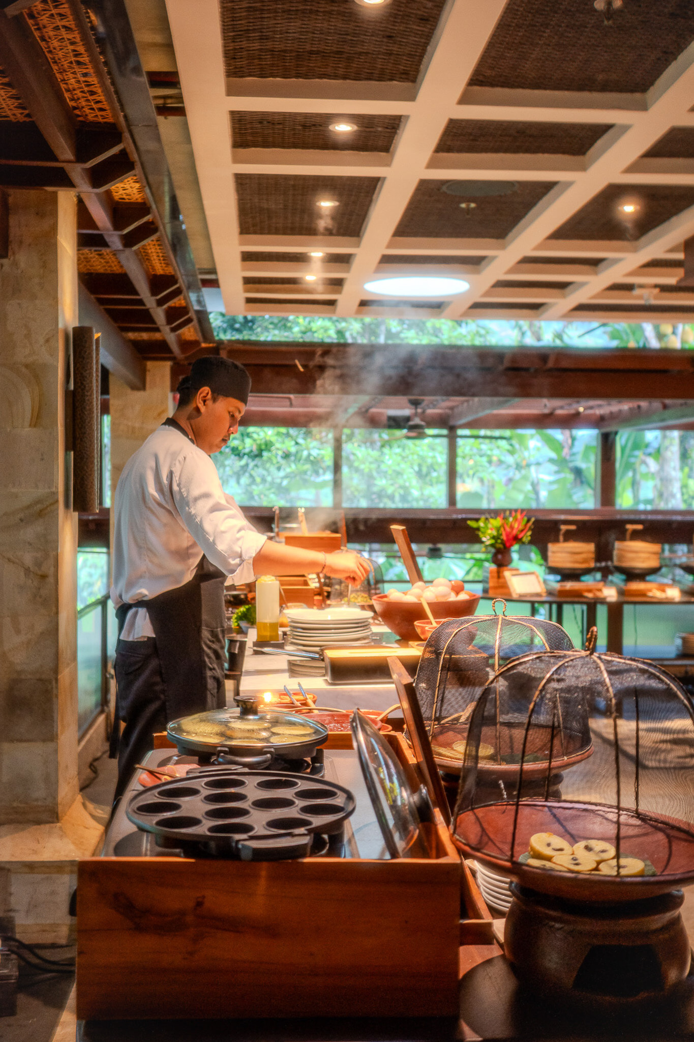 モーニングは「サワ テラス」で、アユン川を望む開放的な空間の朝食ビュッフェを。焼きたてのロティやバリ風パンケーキ、搾りたてジュース──新鮮な香りに包まれて一日が始まる。夜にはバリ舞踊の鑑賞もでき、食事とともに文化に浸れるのも魅力だ。