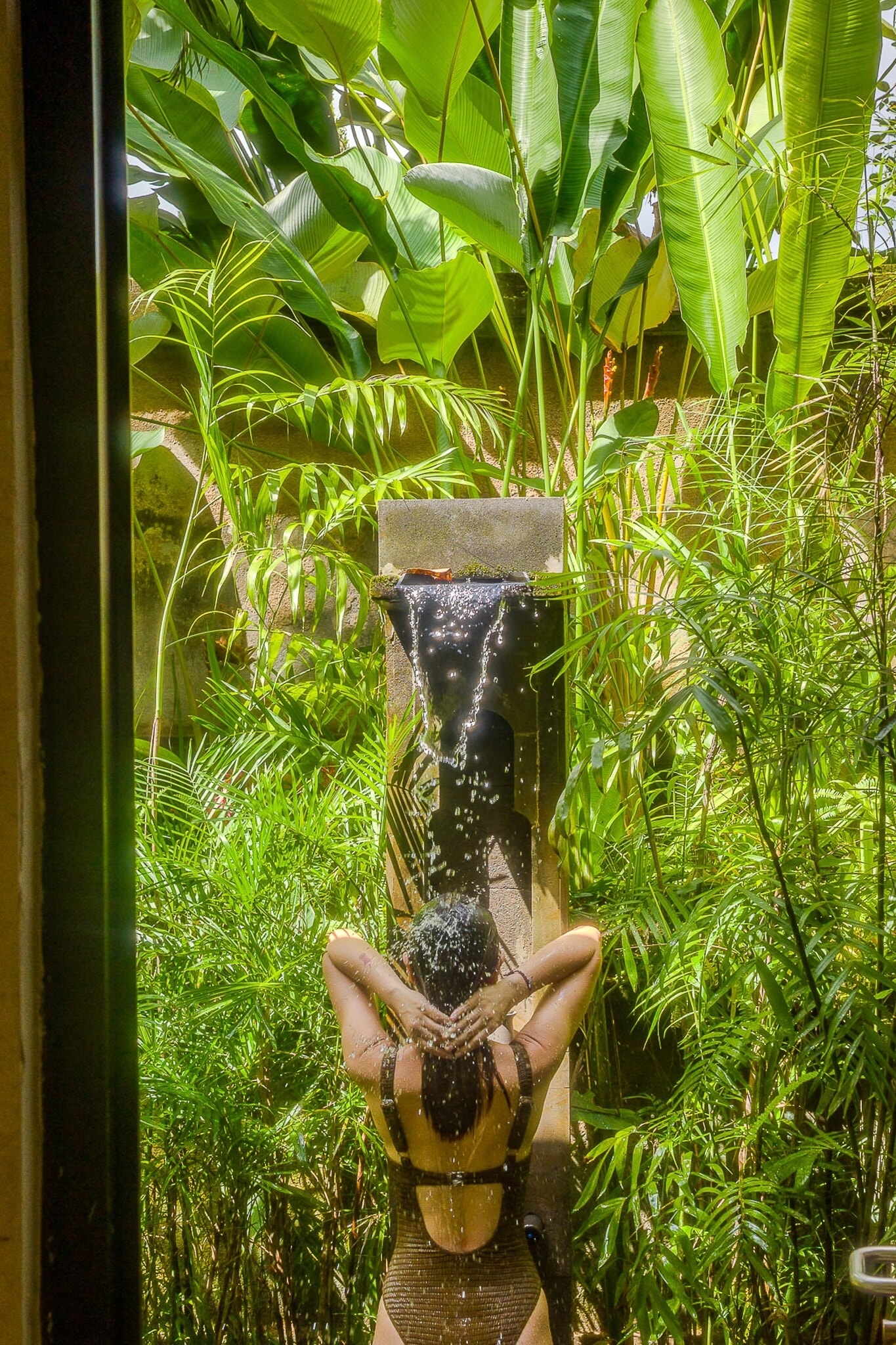 シャワールームは屋内と屋外の2カ所。晴れた日の屋外シャワーは、熱帯の植物に包まれたジャングル感が心地よく、まるで自然に抱かれているよう。