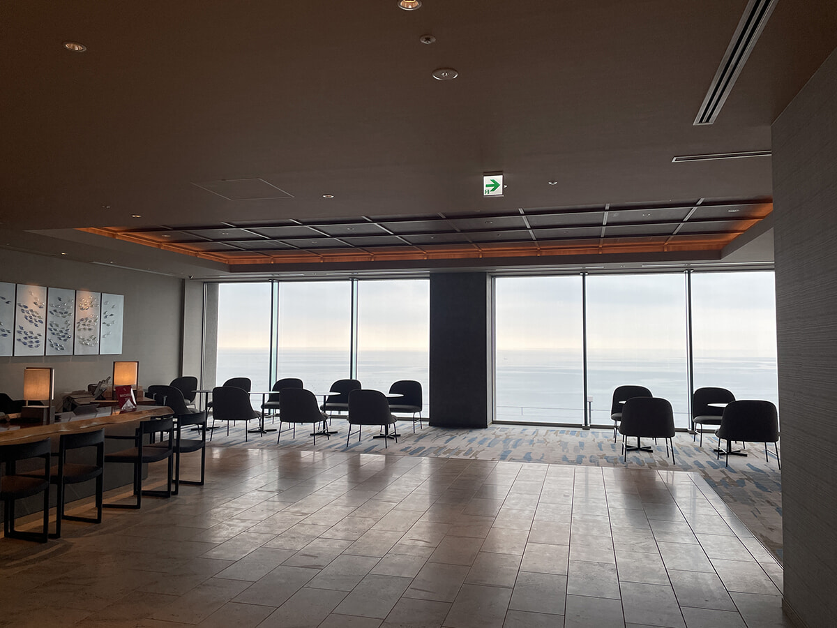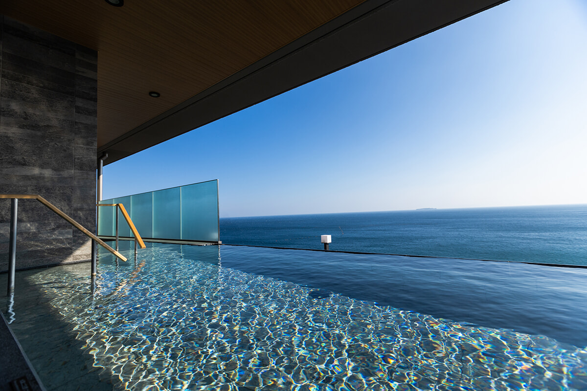 伊豆山を背後に控え、目前には相模湾を一望する傾斜地に立地する佳ら久。エントランスは山側にあるため、海の気配をまったく感じないまま最上階のフロントロビーへと上がります。で、エレベーターを出た途端、目に飛び込んでくるのがこの絶景! 壁面のほぼすべてを占めるガラス窓の向こうには見渡す限りの海と空が広がり、しょっぱなから気持ちが上がりまくり。