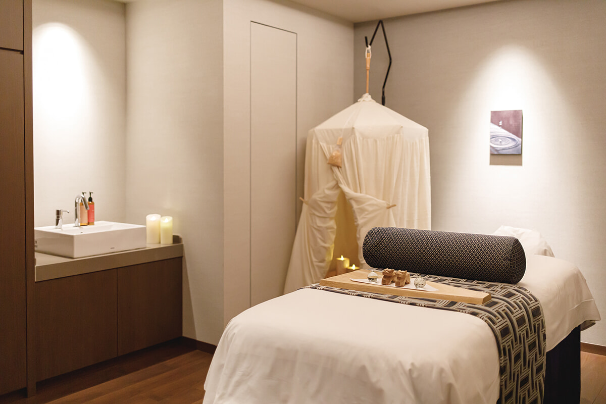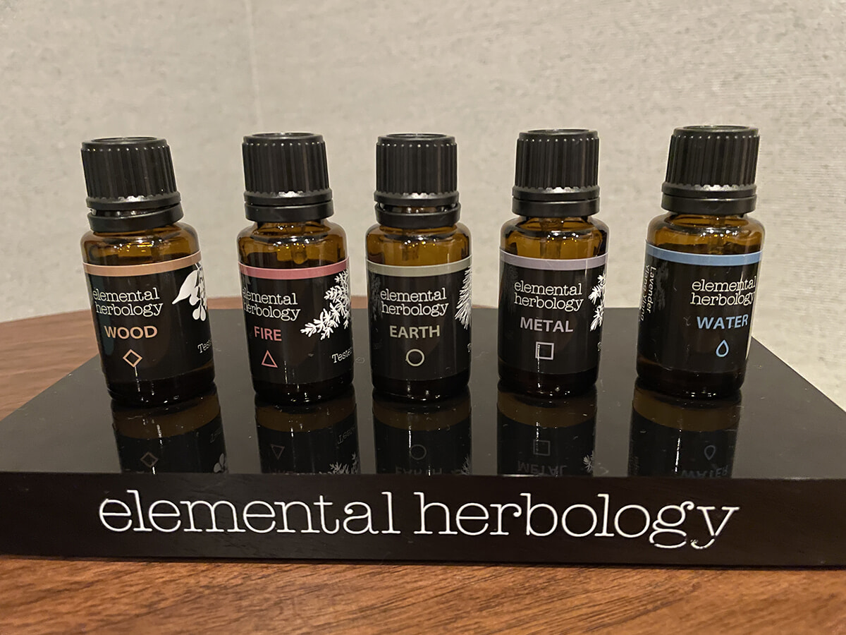 甘やかし時間の幕開けは「Izusan Spa AIOI」から。古くから龍神が宿る特別な場所と伝えられてきた伊豆山のパワーがさまざまに取り入れられていると聞き、ワクワクしながら活力注入態勢万全でスタート。施術で使用されるのはエレメンタルハーボロジーのボディオイル(写真上)で、五行説に基づく「木、火、土、金、水」という5つのエレメントに応じてブレンドされたオイルが用意されています。簡単な質問に答えて自分のエレメントに合うオイルを選んだ後は、ハーブテント(写真下奥)に。ハーブの蒸気の中にはこの地の神木・大楠に由来するアロマを垂らすなど、ここだけのスペシャルな趣向に体の内側からパワーがみなぎってくるよう。今回体験したのは通常メニューのひとつである、ボディのコリを重点的にケアしてくれる「ディーププレッシャーボディ」でしたが、11月1日から新しくシグネチャーメニューがスタートし、そちらも上記の内容は共通だそう。